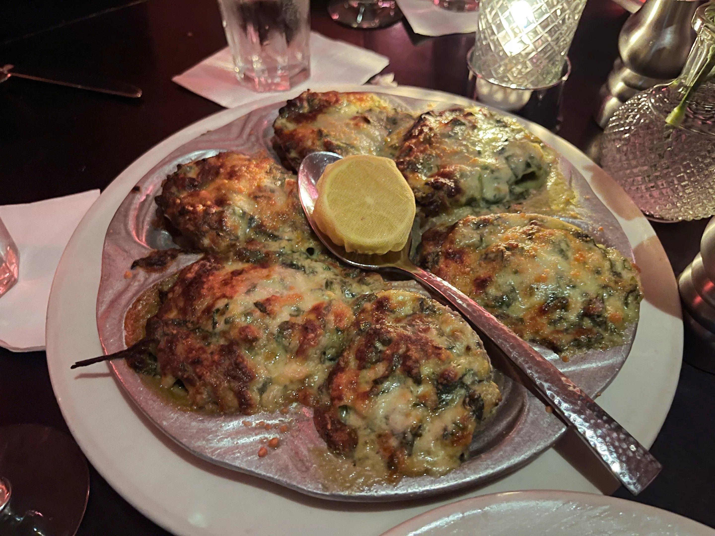 The lemon doesn’t help the oysters Rockefeller much, either. I’m unsure how the original recipe’s blend of bright, aromatic herbs was supplanted by piles of gloppy creamed spinach and chewy chunks of bacon, but no amount of acid is going to pull them back from the precipice. I’ve sampled some leaden renditions over the years, but few have landed harder in the pit of my stomach than these.