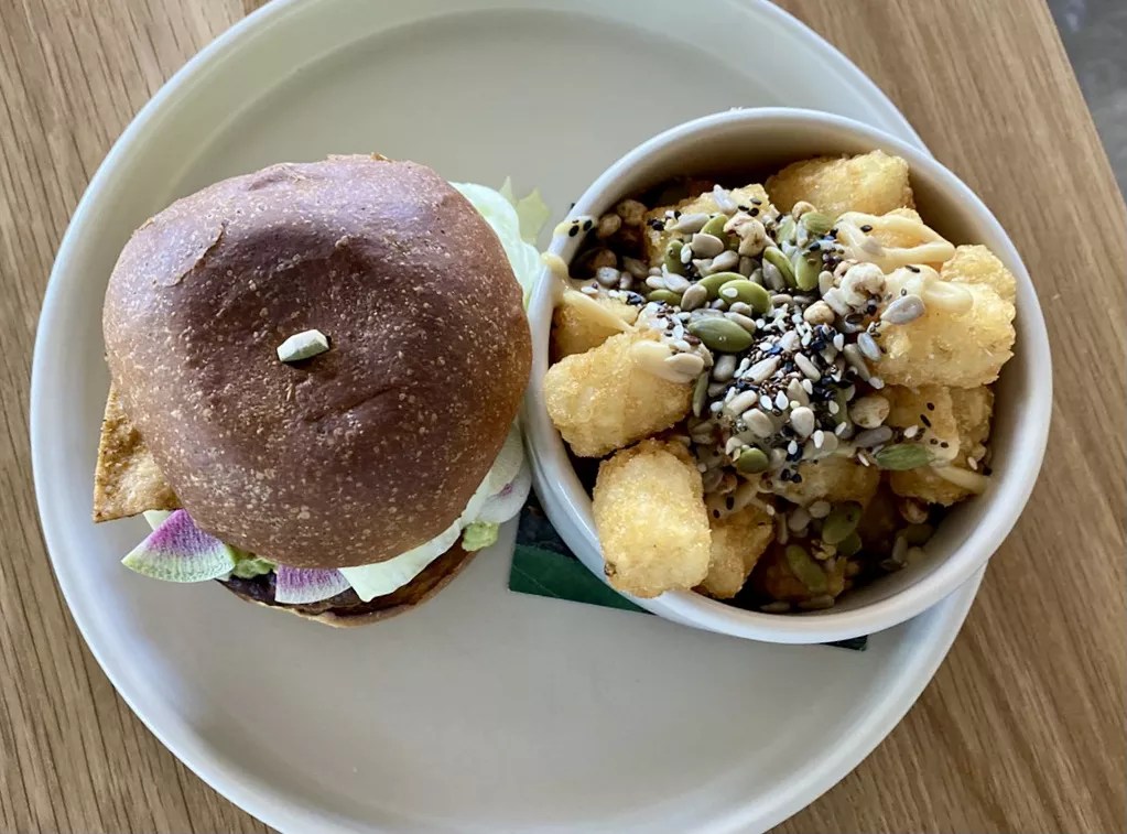 The Veg Burger is made with tepary beans and tempeh and served on a squash bun with tots on the side.