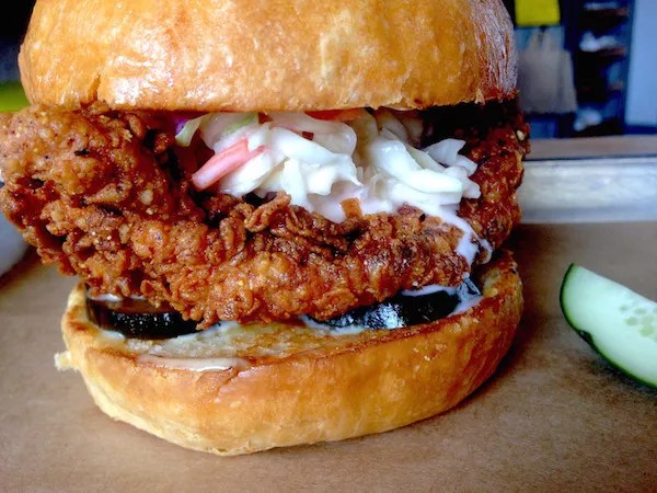 A spinoff of the late Noca restaurant’s quick lunch menu, Nocawich is found just north of Arizona State University’s Tempe campus serving breakfast and lunch items – and, obviously, sandwiches. The What the Cluck? is like not having to decide between fried chicken and a good sandwich on your lunch break. For this dish, the chicken breast is brined in seasoned buttermilk overnight, and dredged in a flour and cornmeal mix. Find a crispy, juicy fried chicken breast accompanied by slaw and B&B pickles – all covered in a honey Dijon sauce. A house-made Parker roll holds the delicious mess together, and that’s all you really need to know.