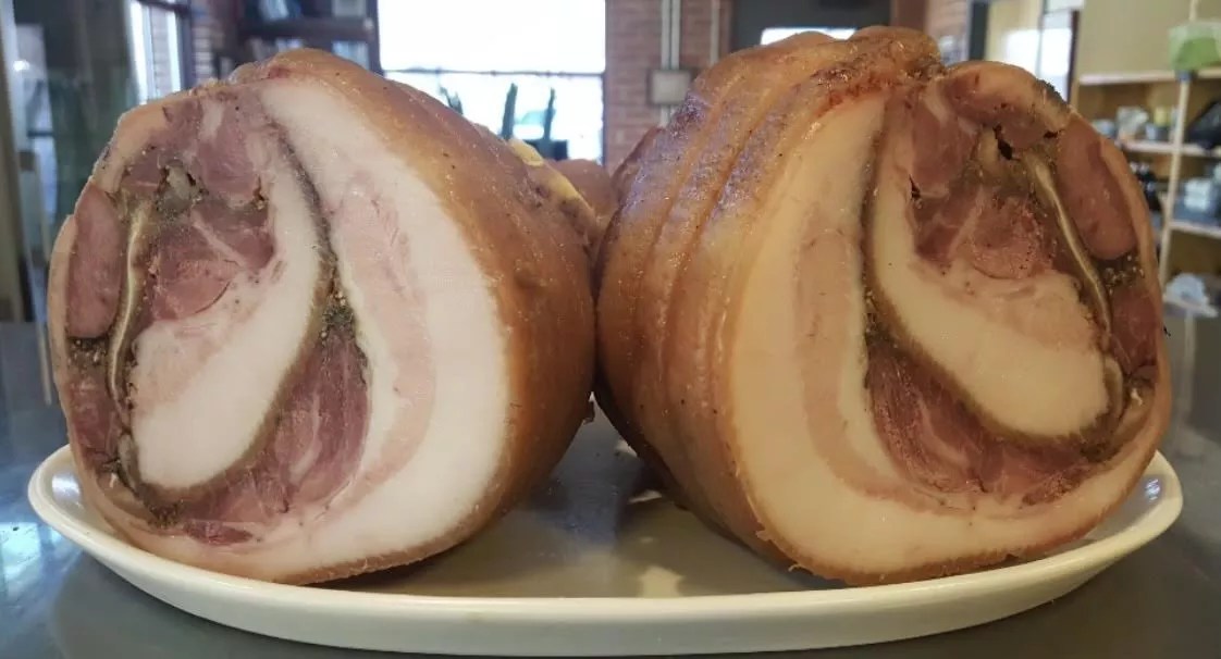 A cross-section of the Porchetta Di Testa sold at Underbelly Meat Co.