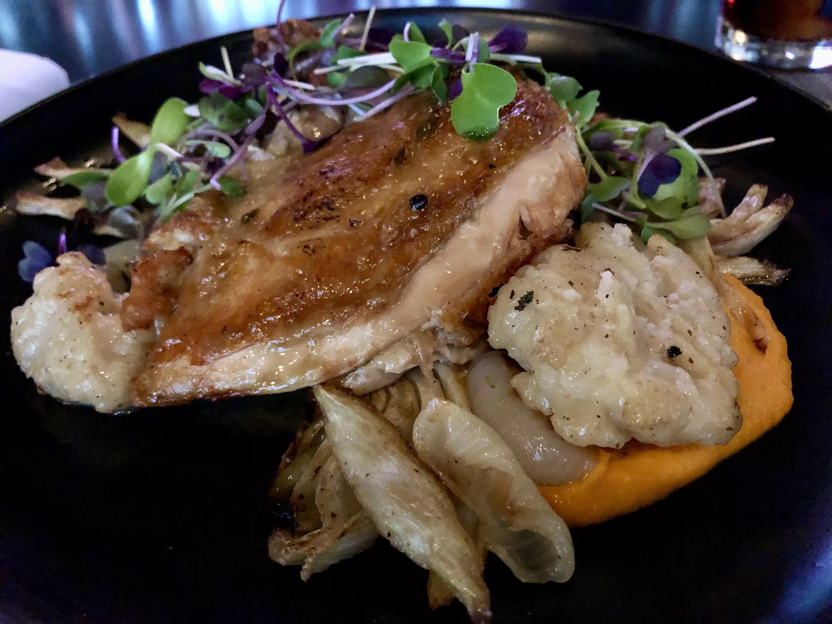 This is a hunk of juicy, high-flavored chicken, topped with microgreens. It’s placed half atop the dish’s pan-seared dumplings, charred onions, and carrot puree – the whole thing looking like a wild bouquet. Eating this takes strategy, as you’ll want each bite to feature a bit of each element. And when it does happen – a little bit of savory chicken, soft dumpling, sauce-like carrot – it’s understood why it’d be an entree recommended.