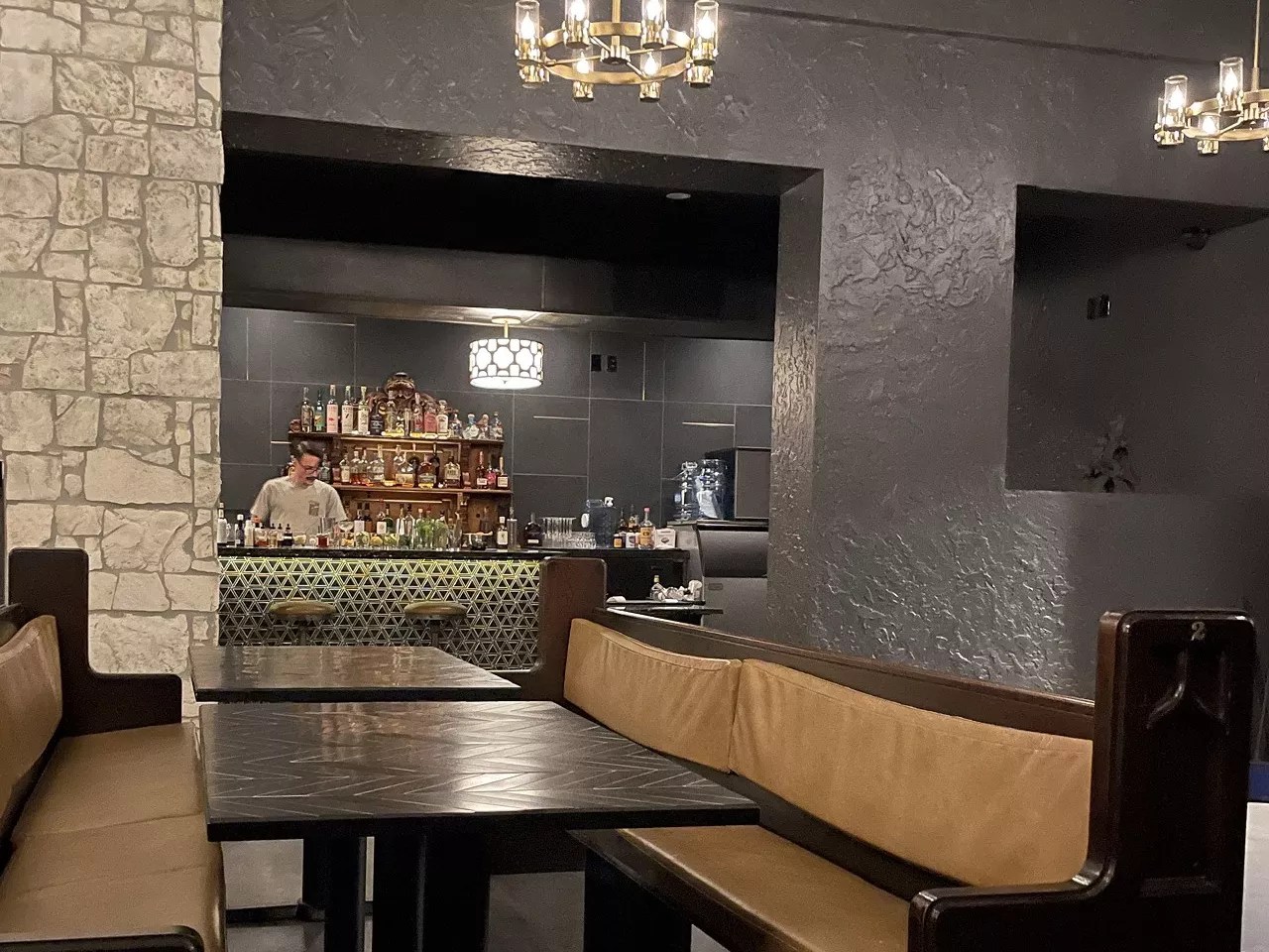 At Sin Muerte, the interior is moody, accented by rich wood and geometric tile.