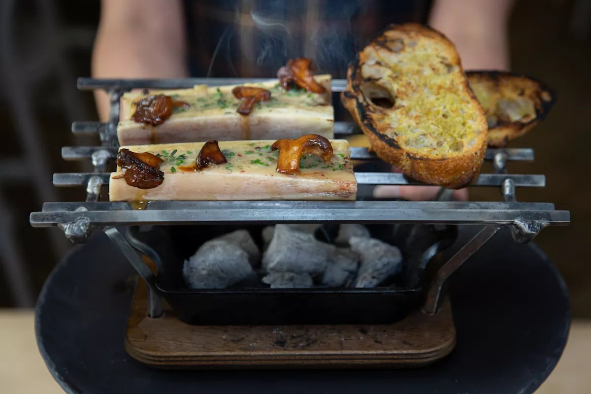 The roasted bone marrow is one of Daniel’s favorites and rightfully so. Two sizeable split bones are served on a portable grill, a meaty display of decadence that smokes and seduces with its brandy, butter, and garlic scent. The whole thing is topped off with shaved trumpet mushrooms.