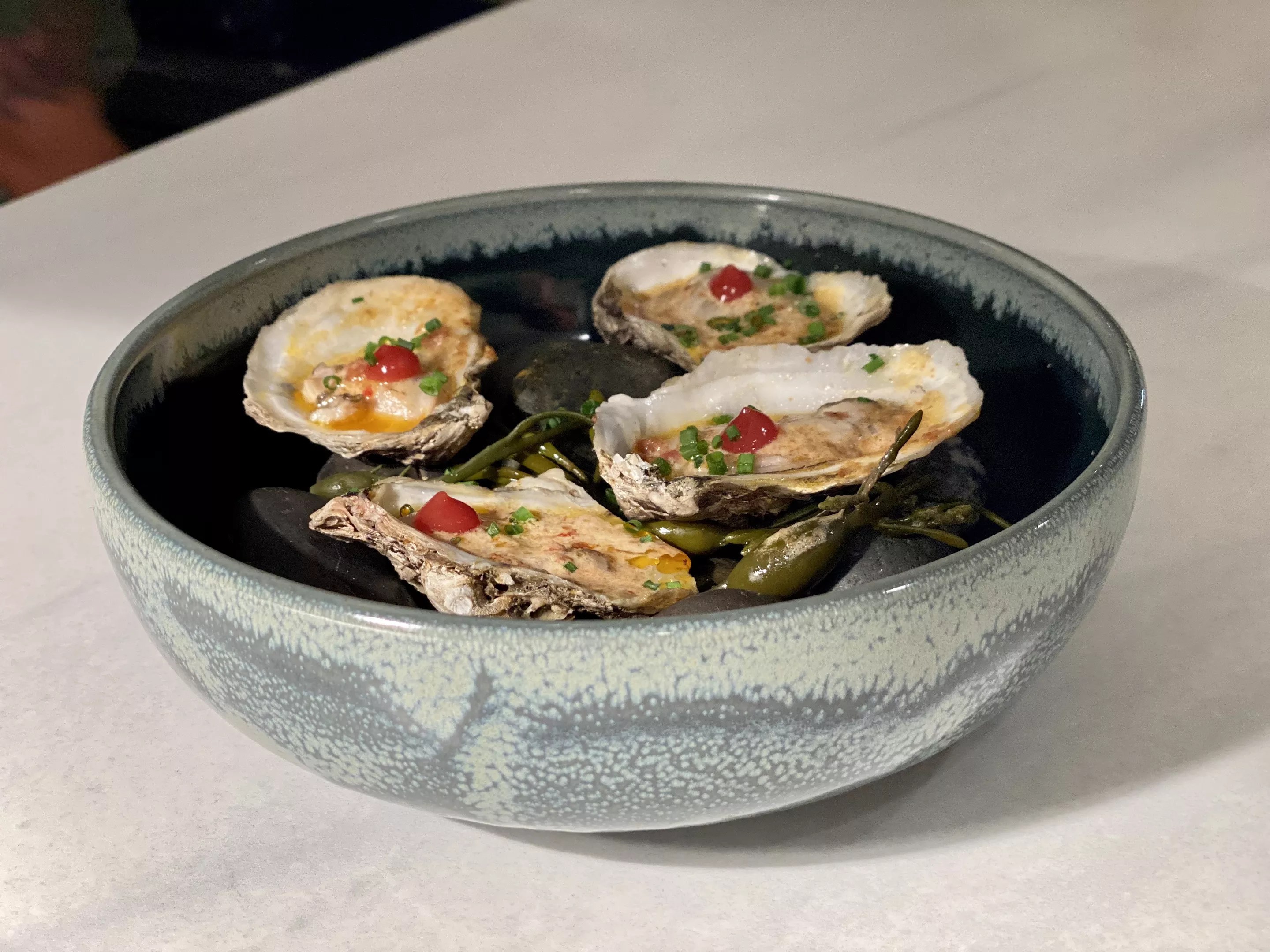 Plump raw oysters are served on a bed of ice laced with knotted kelp.