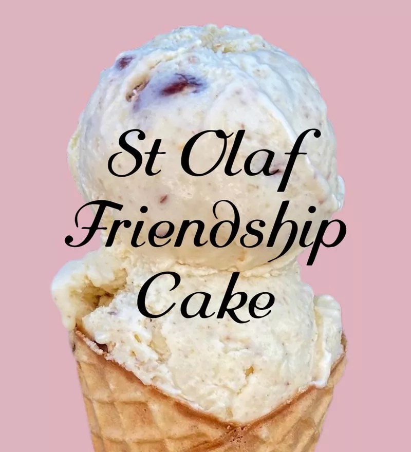 Vanskapkaka really does means friendship cake in Swedish and resembles visiting cake, which is an actual Swedish dish. It’s that dish that inspires the new flavor of ice cream, called St. Olaf Friendship Cake. It is roasted almonds and vanilla cake in brown butter orange zest ice cream.