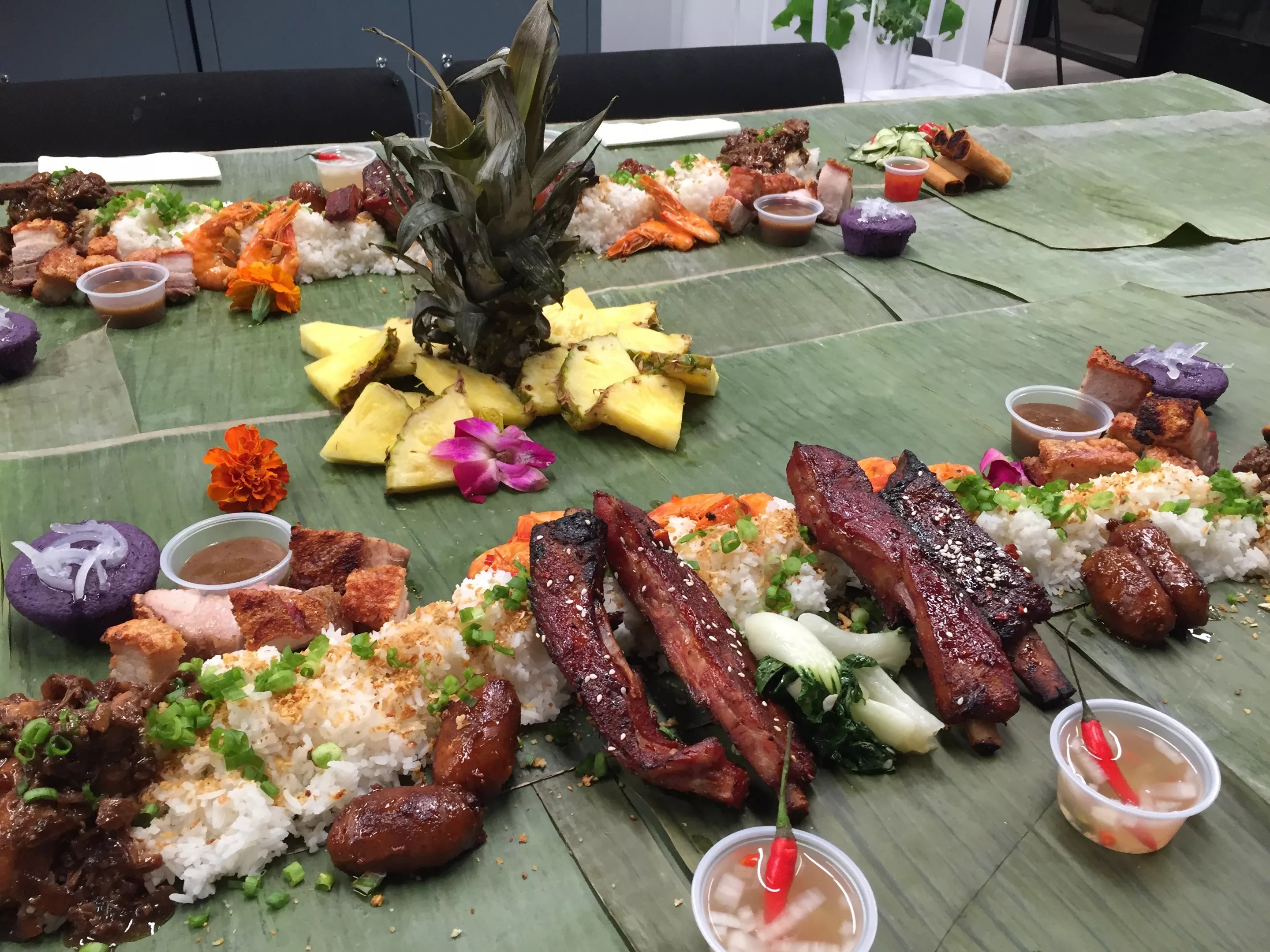 Diners in Mesa circled mounds of pork, chicken, shrimp, and rice piled on top of banana leaves, trying to frame the perfect photo for Instagram and other social media feeds. Then, they prepared to dig into a meal with no utensils or plates. This was all part of the Filipino pop-up Tayo and its first Kamayan dinner at the Fuerza Local Community Kitchen this past Saturday night, October 5.