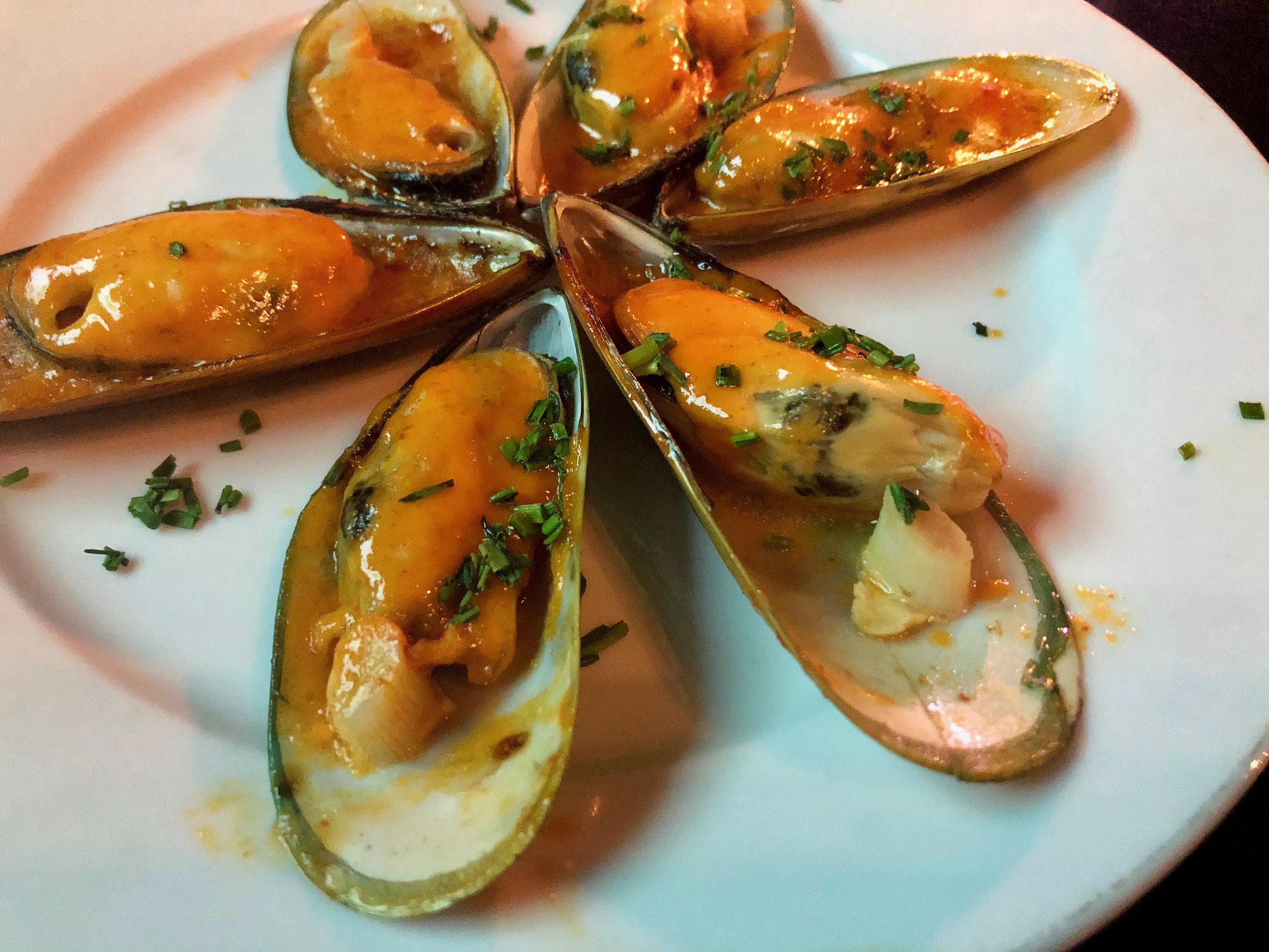 Wanting to appetize, we couldn’t decide between the crisp calamari or Mussels Dynamite. A server suggested the latter, and we were thankful for it. Roasted green mussels came arranged like a seafood-y flower on the plate. They also came with dynamite sauce, which the server warned us was spicy. It wasn’t, but it was still good.