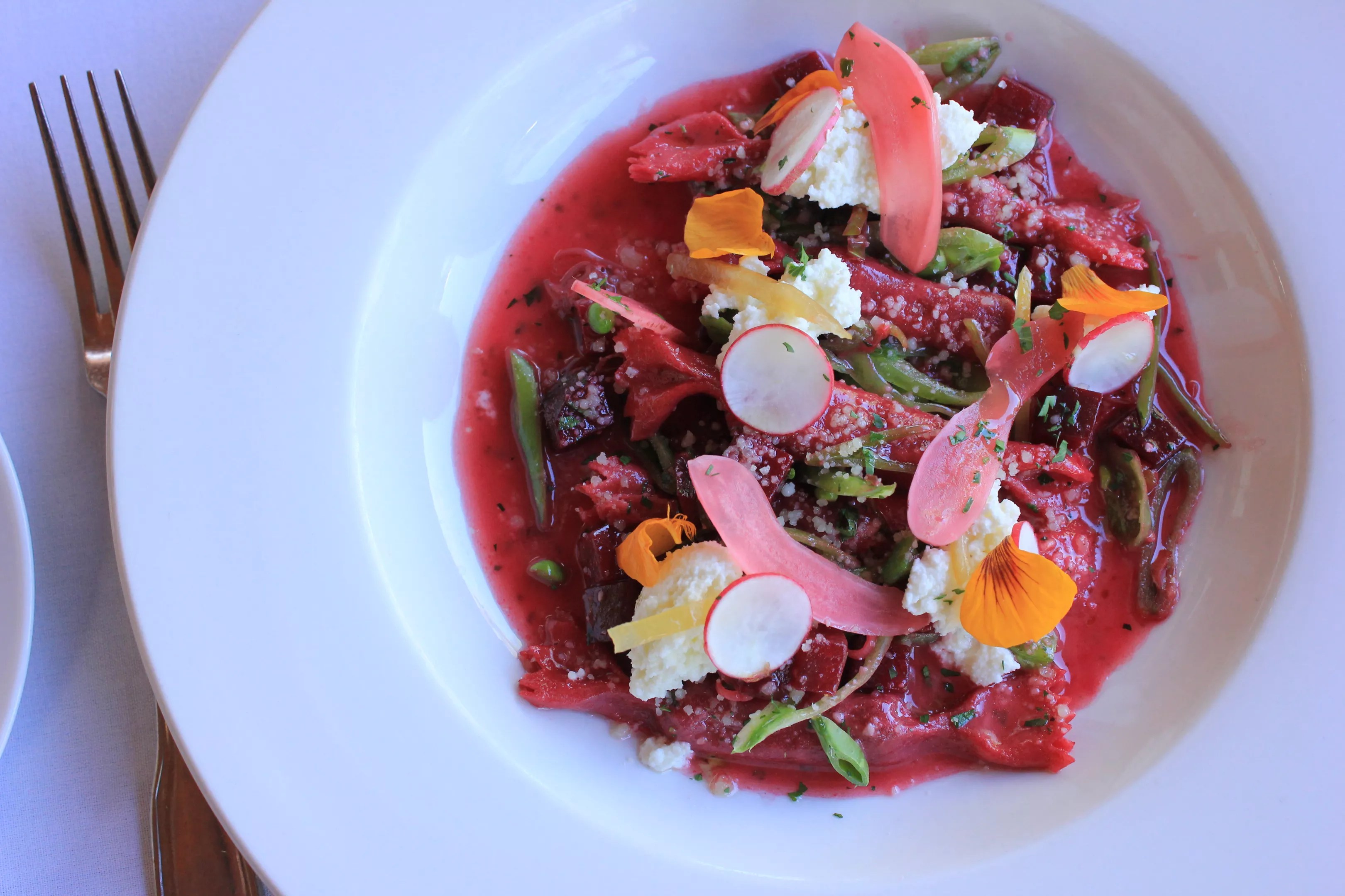 Beets color the pasta. They come right from the garden. The eggs in the dough come from the property, too. The dough for the caramelle is mixed from beets, eggs, salt, and Hayden 00 flour. The only way you could get any fresher would be to dry the salt and mill the flour yourself.