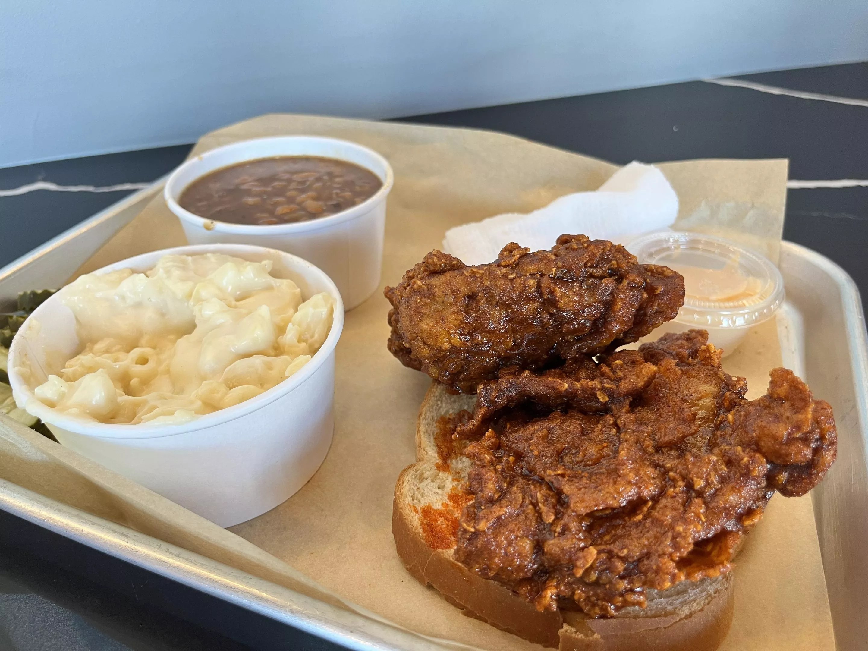 His experiments turned into the couple’s latest restaurant concept. At Full Speed, the menu offers fried chicken tenders, drumsticks and thighs in three heat levels ranging from “Southern” being the mildest and “hottie hot hot” on the other end of the spectrum. All of the chicken is fried-to-order in beef tallow saved from Little Miss BBQ.