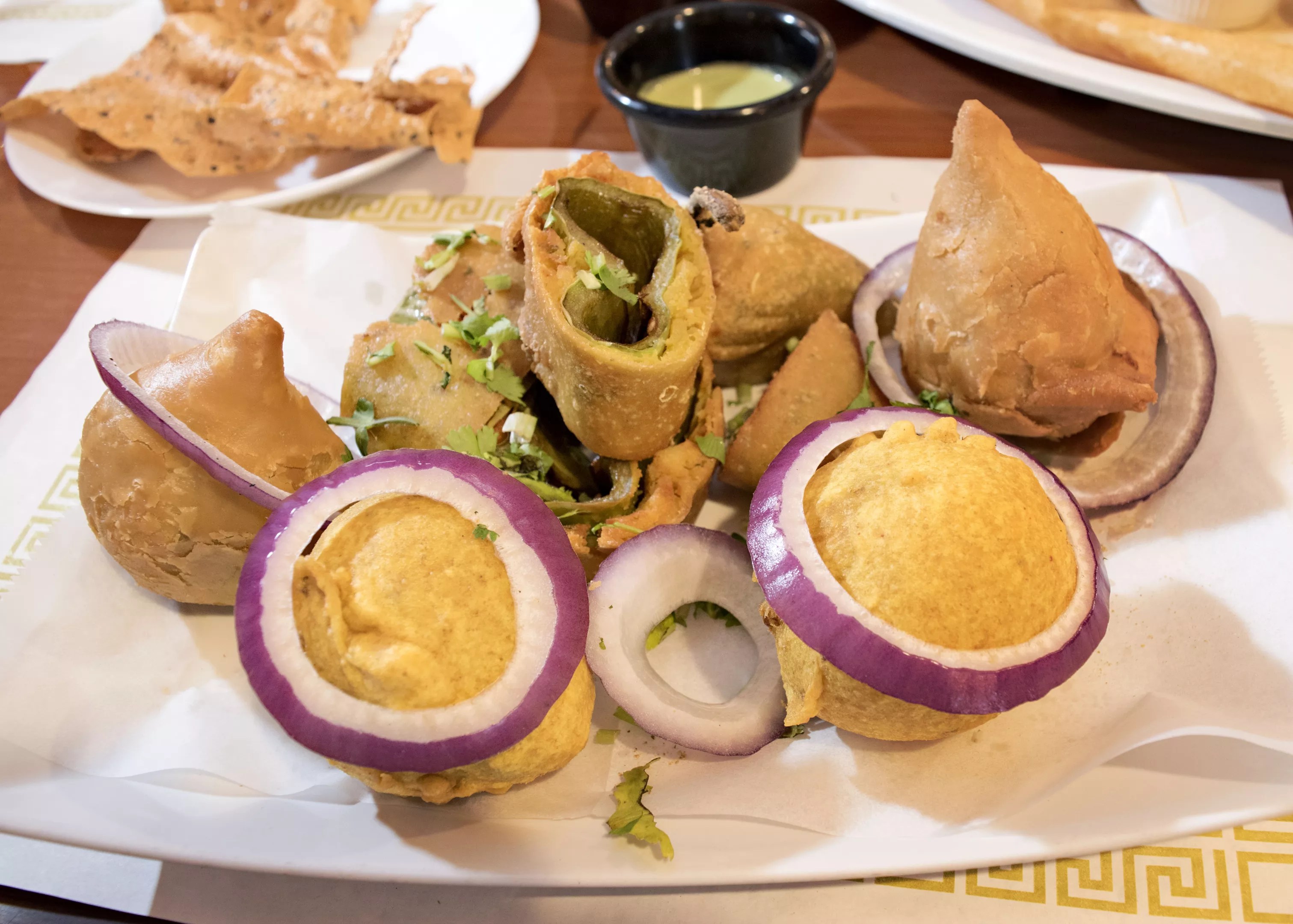 From there, you’ll want to linger over Godavari’s sprawling appetizer menu. A good place to start is with the vegetarian platter, a satisfying mix of crispy, fried treats, including a crisp veggie samosa, a couple of aloo bonda – deep-fried spheres stuffed with mashed potatoes – and fried mirchi peppers, a spicy and popular South Indian tea snack.