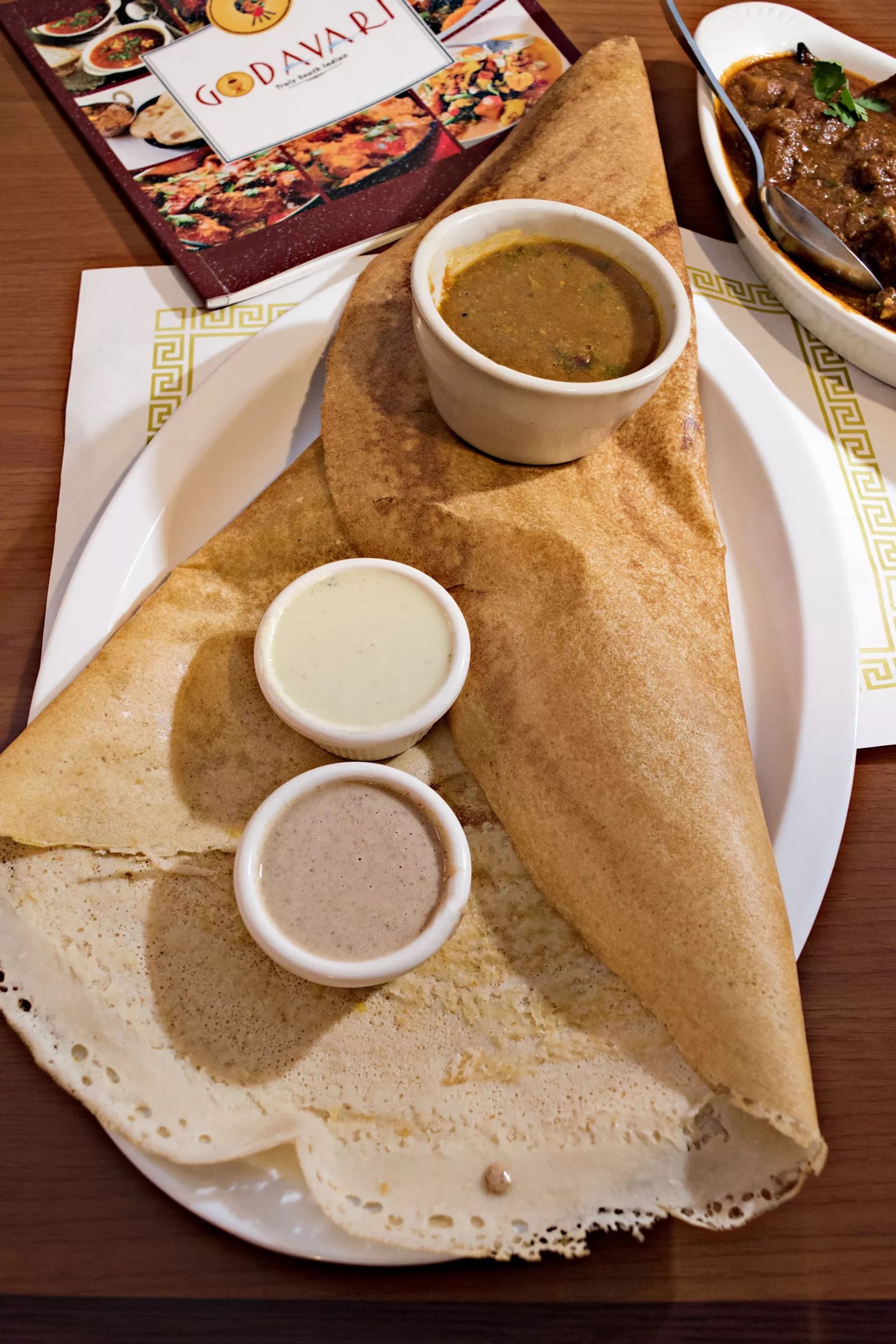 If there’s a focal point on the Godavari menu, though, it’s the restaurant’s dosas. The thin, rice-lentil pancakes are configured into various papery scrolls and conical shapes, and served with various small steel bowls brimming with chutneys and a thin, tamarind-vegetable sauce called sambar.