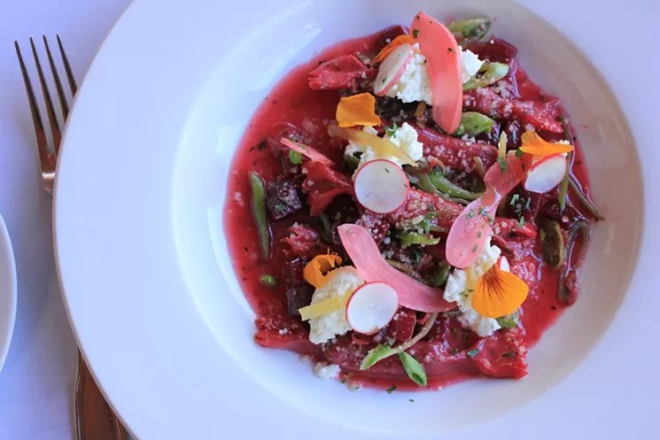 Dustin Christofolo is rolling out beautiful beet caramelle pasta at Quiessence in south Phoenix. Caramelle is a stuffed pasta, like ravioli or agnolotti, but shaped like salt water taffy: long, skinny, with twists on the ends. The filling goes in the tubular middle. Christofolo uses a hand-crank machine to make pasta. He has rolled pasta in Italy and learned from afar from some of modern pasta’s luminaries, like The Geometry of Pasta and San Francisco’s Flour + Water, one of the country’s top pasta restaurants. Christofolo prides himself on using ingredients from Soil & Seed, the garden at the Farm at South Mountain, the south Phoenix complex that Quiessence also calls home. Beets from the garden color the caramelle, which tastes earthy and a little sweet. The dough for the caramelle is mixed from beets, eggs, salt, and Hayden 00 flour. The only way you could get any fresher would be to mill the flour yourself.