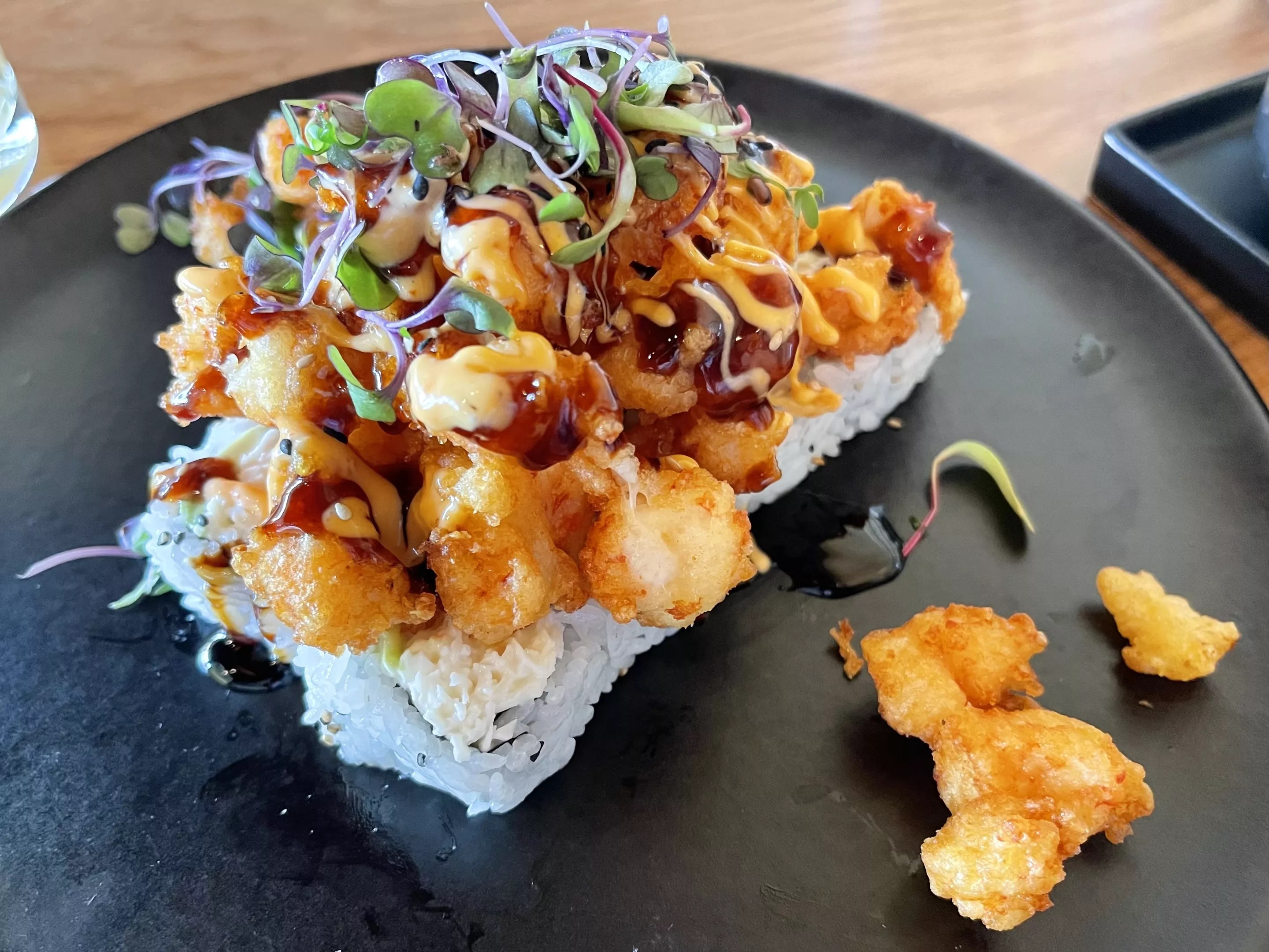 The Baby Langustine roll at Sandfish Sushi is topped with crispy nuggets of sweet seafood goodness.