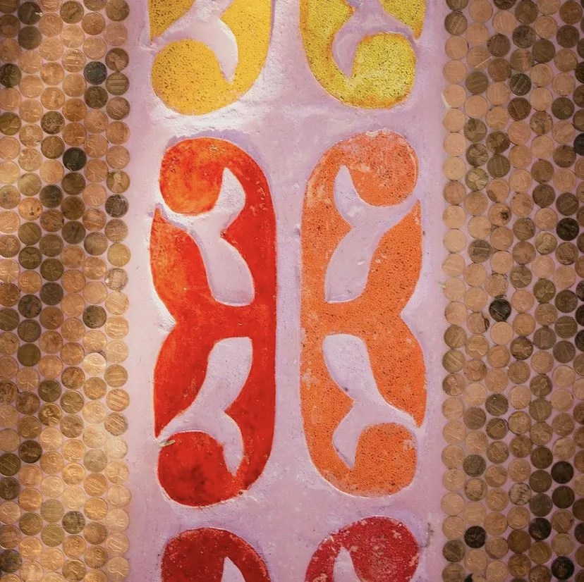 If you get close to the front or back door, you’ll get a glimpse of the penny floor the sisters have created to honor their heritage. Copper is one of the elements that Ho-Chunk people often use, especially in making jewelry. They also use specific floral patterns. The center of the penny floor has an applique ribbon of beaded flowers.