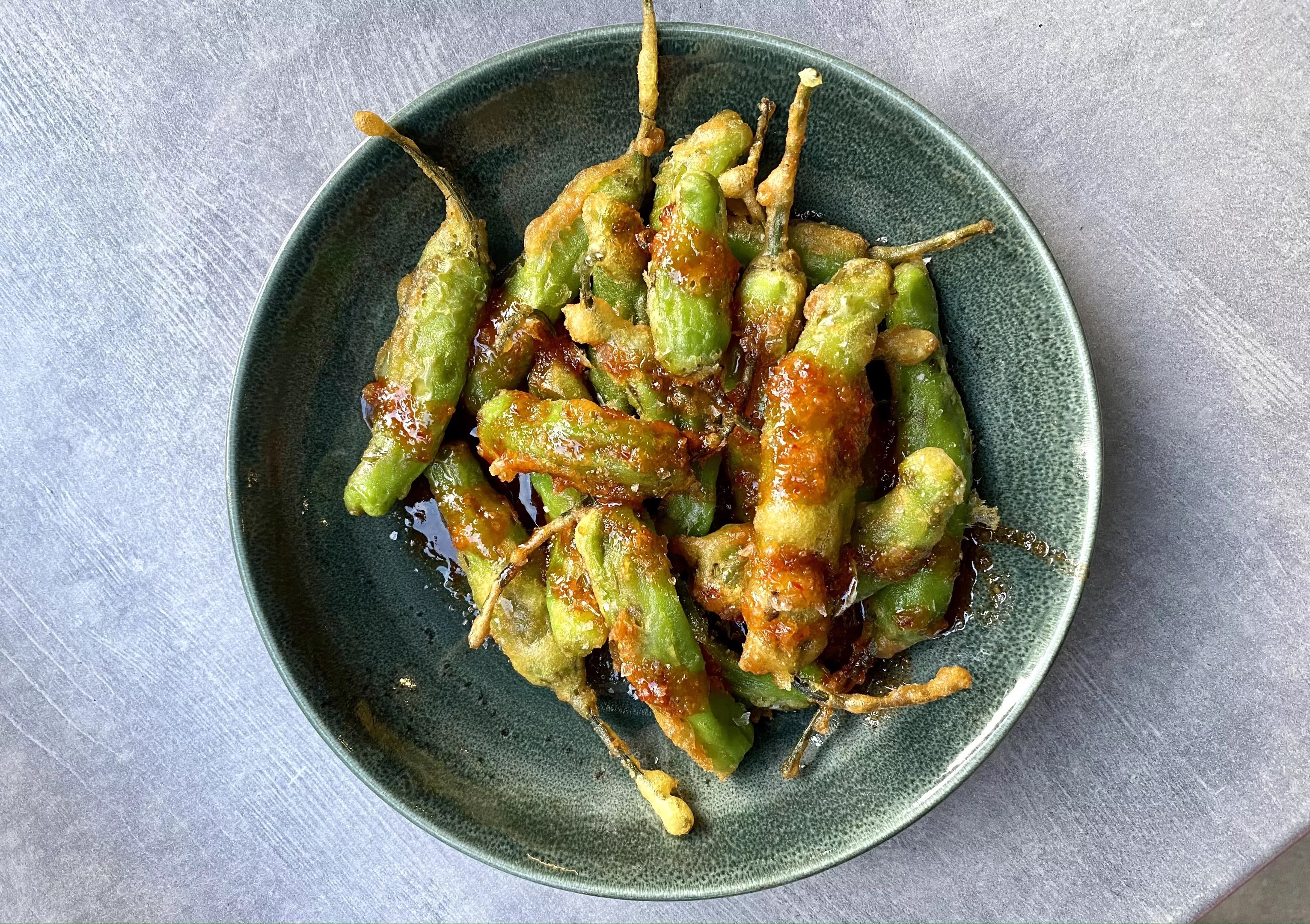 Happy Hour Tempura Fried Shishito Peppers keep your fingers busy and saucy.