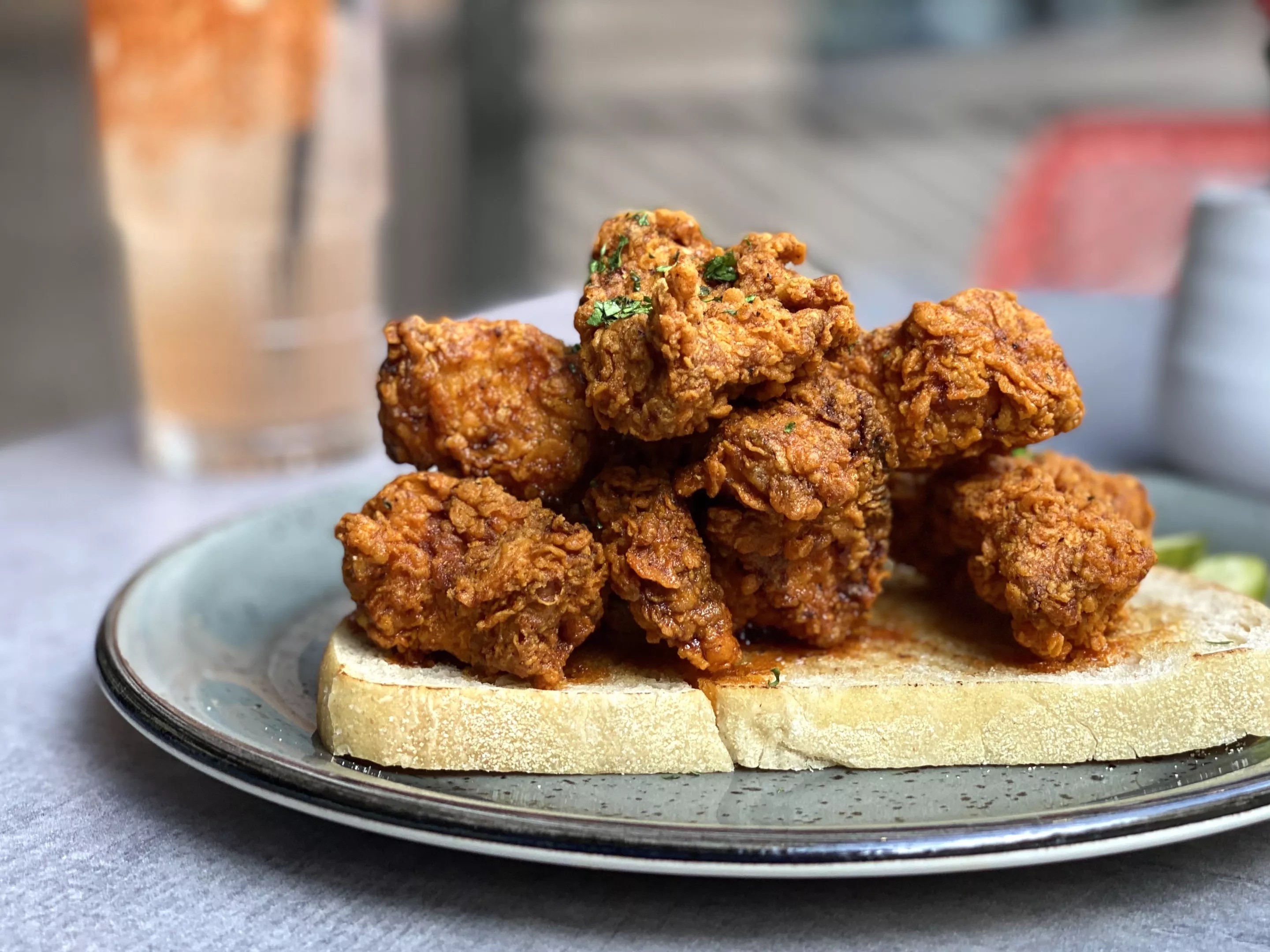 Things get even flashier with the creative cocktail choices, five thirst traps as provocative-tasting as their names. They’re all pretty, photogenic, with minty garnishes and shapely stemware, but beyond appearances, they have more (and better) booze than not. Doctor’s Orders is head bartender Jay’s twist on a whisky smash, an apple-pie-in-a-glass blend of rye, lemon, and apple that finishes with a drizzle of caramel of a microplane of cinnamon. Professor B is day-dreamy with its tropical and transportive mix of white rum, blue curacao, pineapple, coconut, and Jamaican bitters. More delicate and nuanced, the Blood Orange Paloma takes the grapefruit out and puts the Thatcher’s Blood Orange Liqueur in for a sublime tequila-spiked sip that looks like a desert sunset. Plus, the lickable chili lime salt rim gets your taste buds ready to nosh. Adams Table Desert Hot Chicken Bites pack a punch. Allison Young