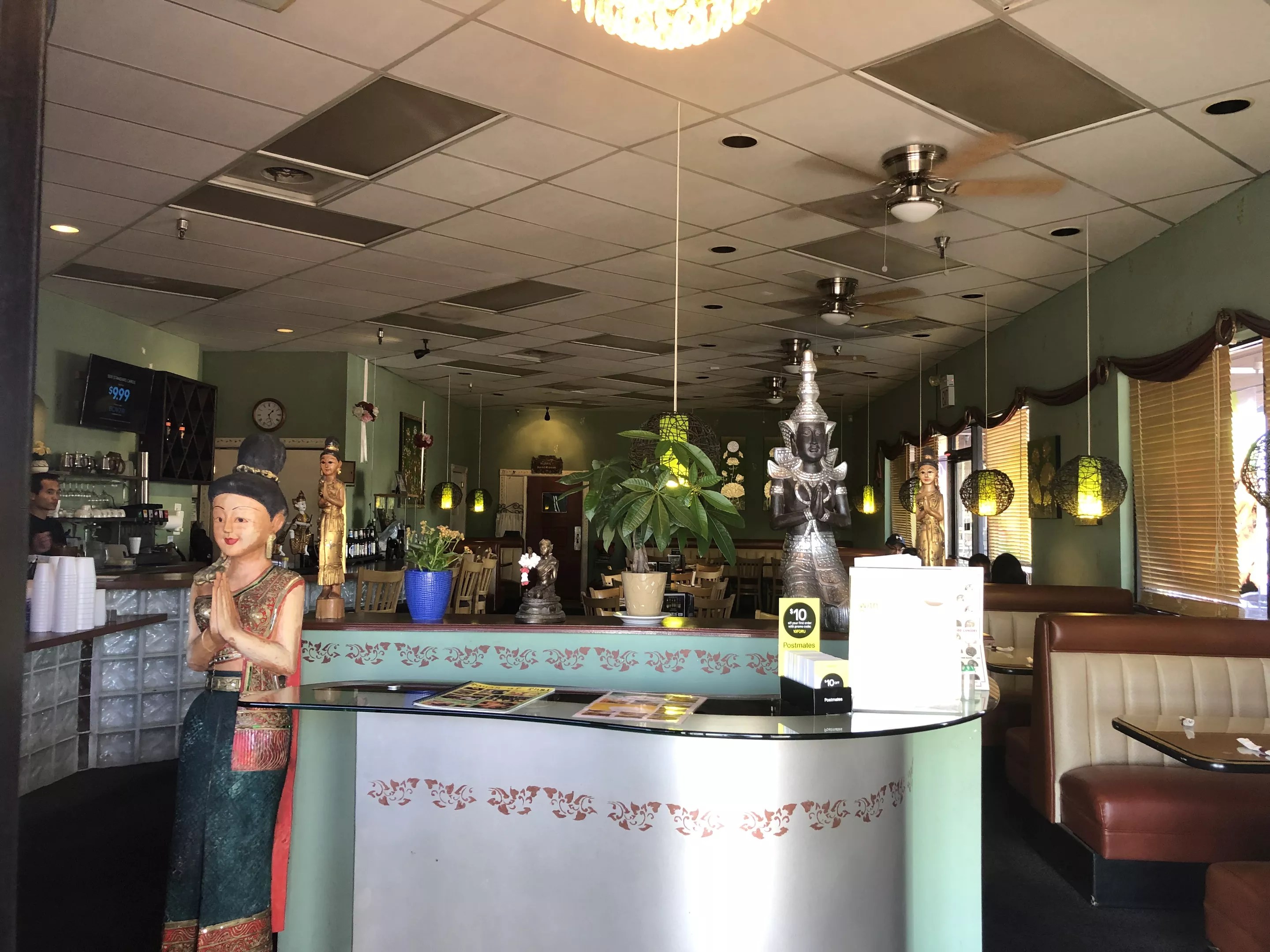 The interior of Touch of Thai is tranquil, with a consistent green hue. There’s a small bar, tables, and booths lining the edges of the dining room.