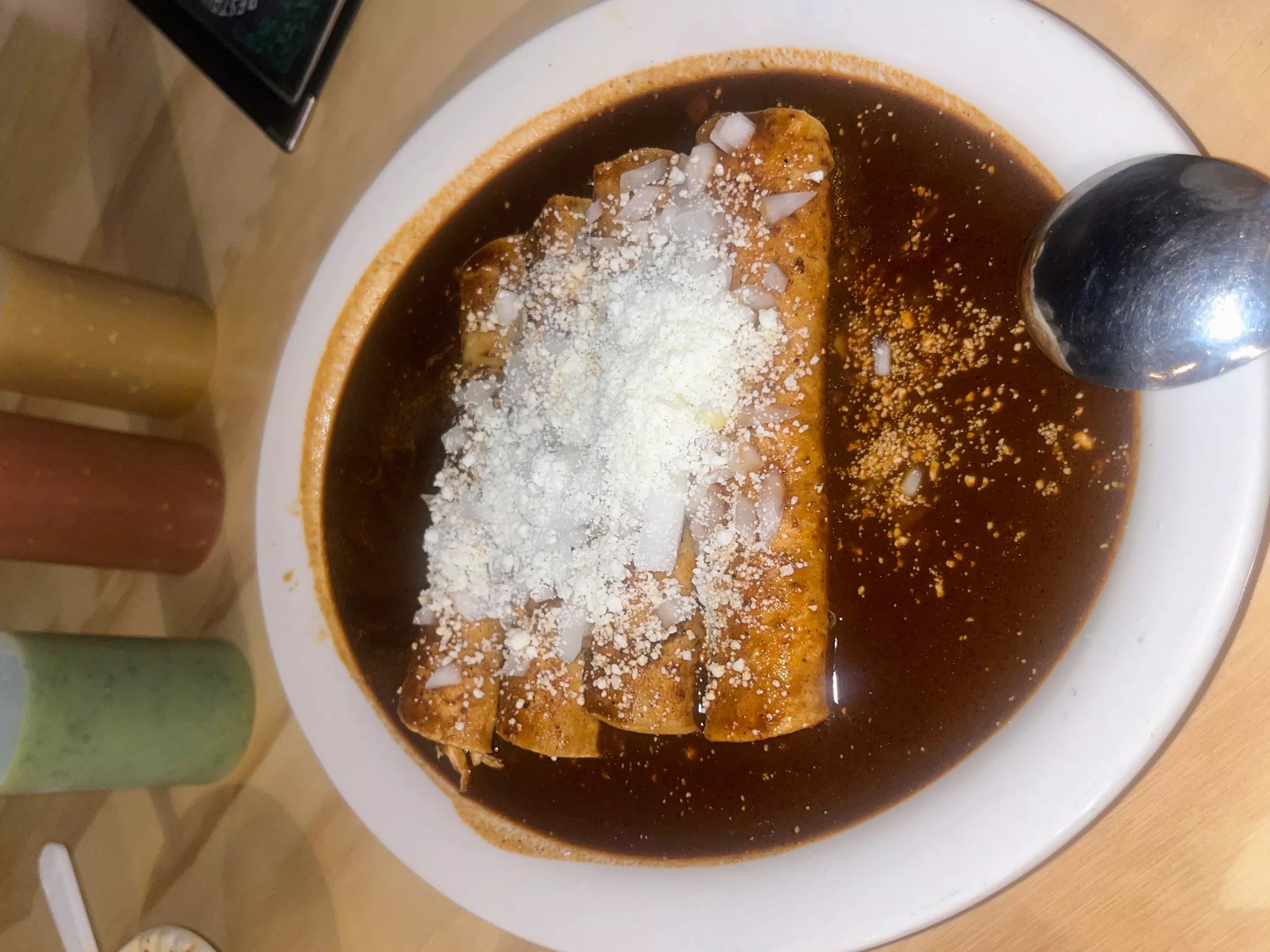 The pieces are swaddled in a deep, satin-smooth mole that resembles dark chocolate but tastes like history. It’s layered, smoky, with a smidgen of sweetness and just enough heat to make you pause and wonder. Each bite balances the earthiness of roasted chiles and nuts with the warmth of bittersweet cocoa. The chicken inside is fall-apart tender and infused with flavor, as if it’s been simmering in stories passed down through generations.