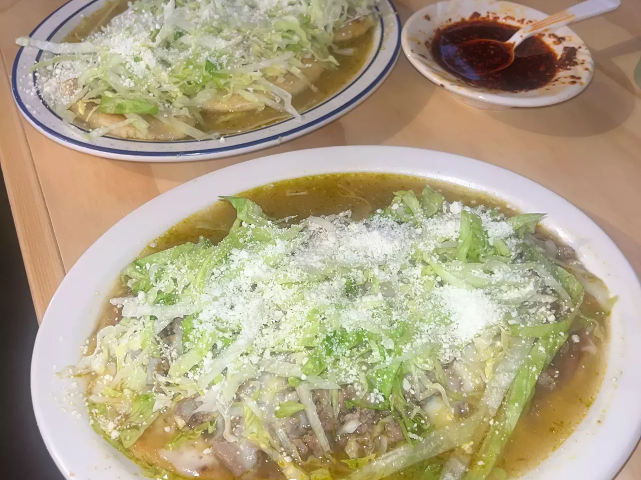 As I take my final bites of the third dish – a huarache ($14) with carne asada and melted Oaxaca cheese, bathed in green tomatillo sauce and topped with shredded lettuce – the dining room starts to clear out. Bonilla brings over some to-go boxes, needed thanks to the generous portions, and then offers one last suggestion.