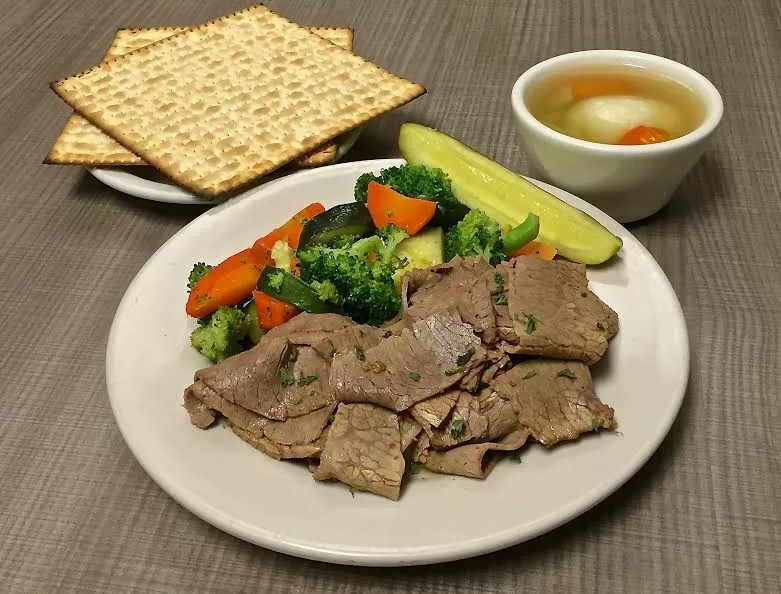 Brisket, vegetables, matzoh ball soup, and more for Passover at Miracle Mile Deli.