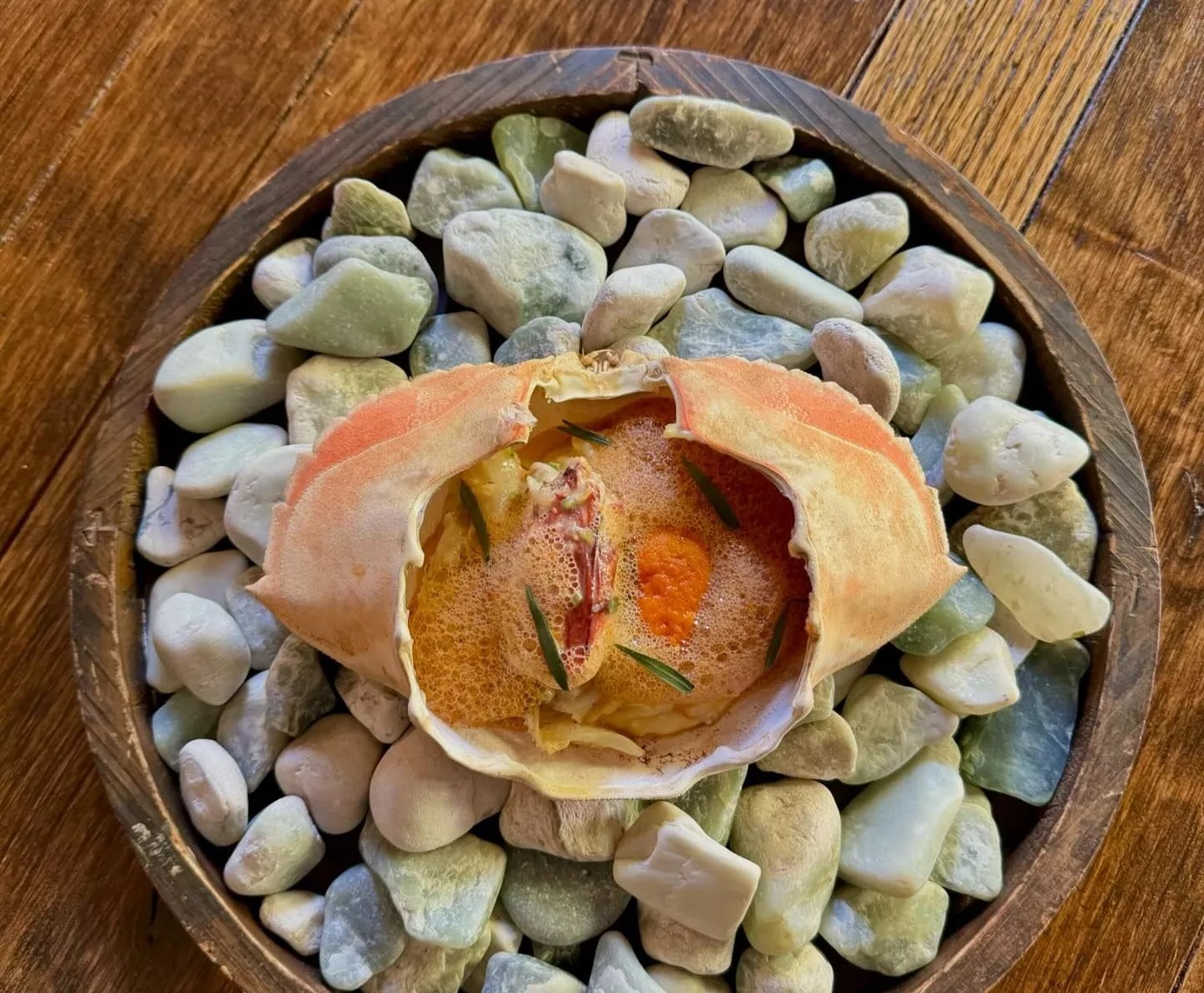 A dish from The Larder & The Delta’s 12-course tasting menu. Blue crab, sea urchin and tarragon sit atop yellow corn grits.