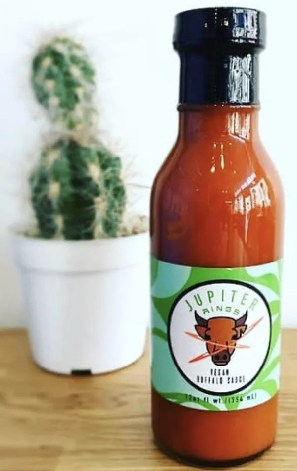 The birth of his son coincided with an inbox flooded with orders. VegNews did a giveaway and recommended his sauce, stating, “This brand nails the flavor and spice level every time.” Higgins’ business took off. Come July, a number of Sprouts stores nationwide will be carrying what has now been dubbed Jupiter Rings Buffalo Sauce.