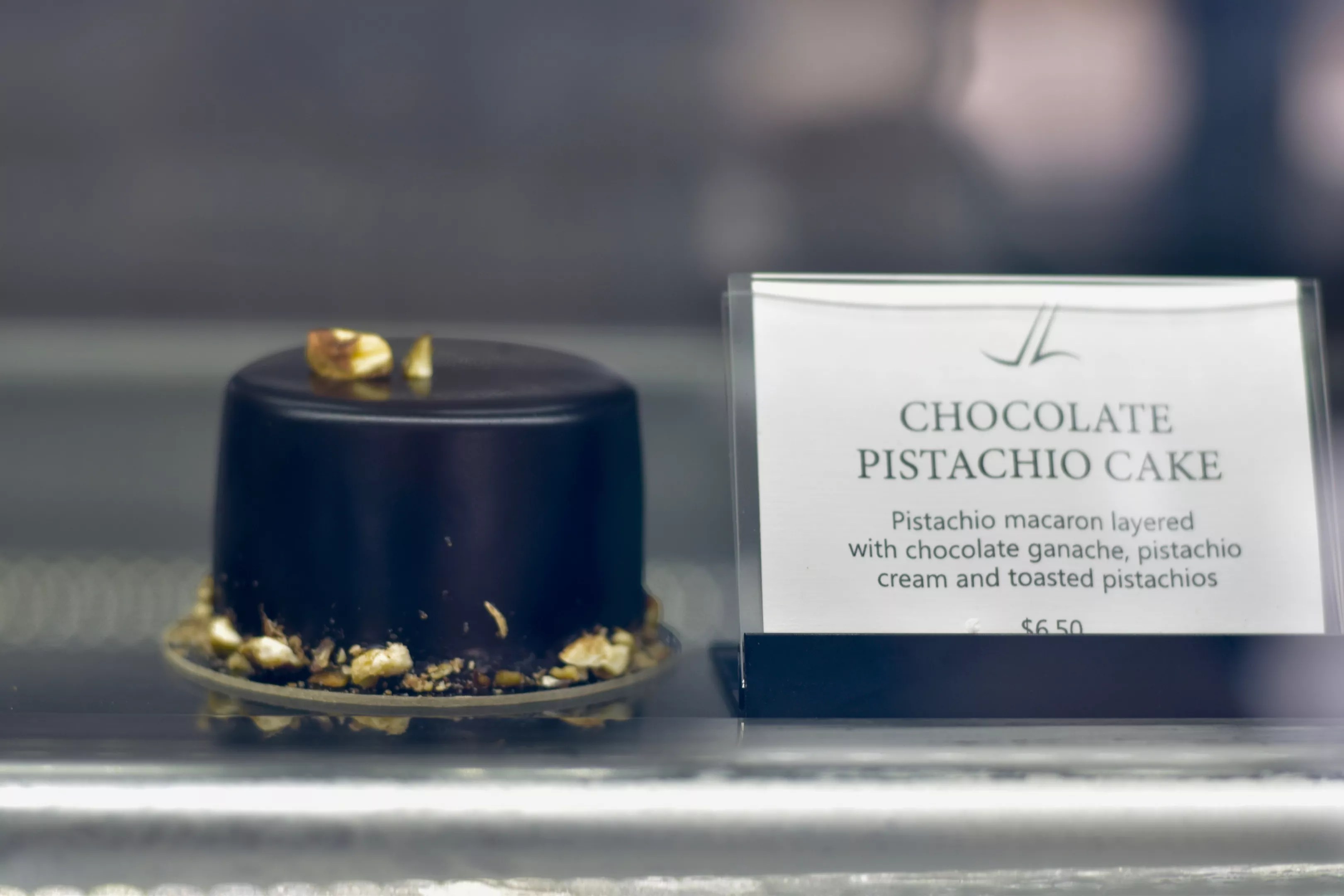 Chocolate pIstachio cake on display at JL Patisserie Phoenix.