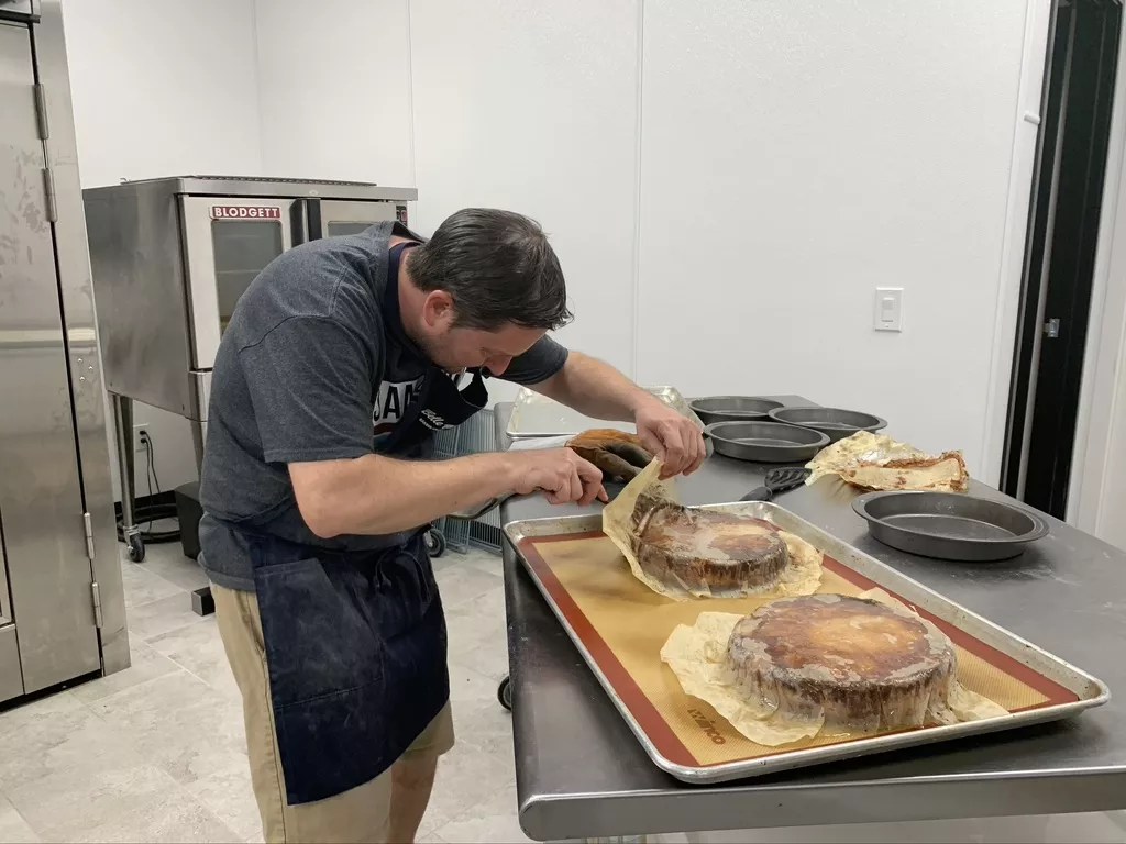 Nathas Kraus patiently peels the parchment paper off his traditional kouign-amann.