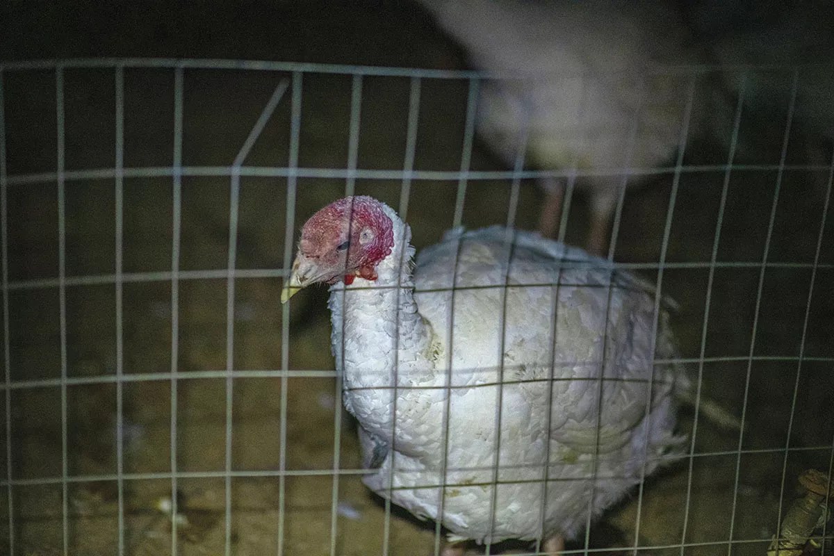 As we crossed to the sunny turkey pen, the birds started to gobble madly. I’ve briefly worked on four farms and visited many more for reporting, but the continuous, high-pitched gobbling of an 80-turkey chorus gave me a cold shiver – a feeling of wonder and guilt. The flock of turkeys then started to move as a whole, almost like a slow fluid, with a riot of oddly musical squawking, to the pen corner we were nearing.