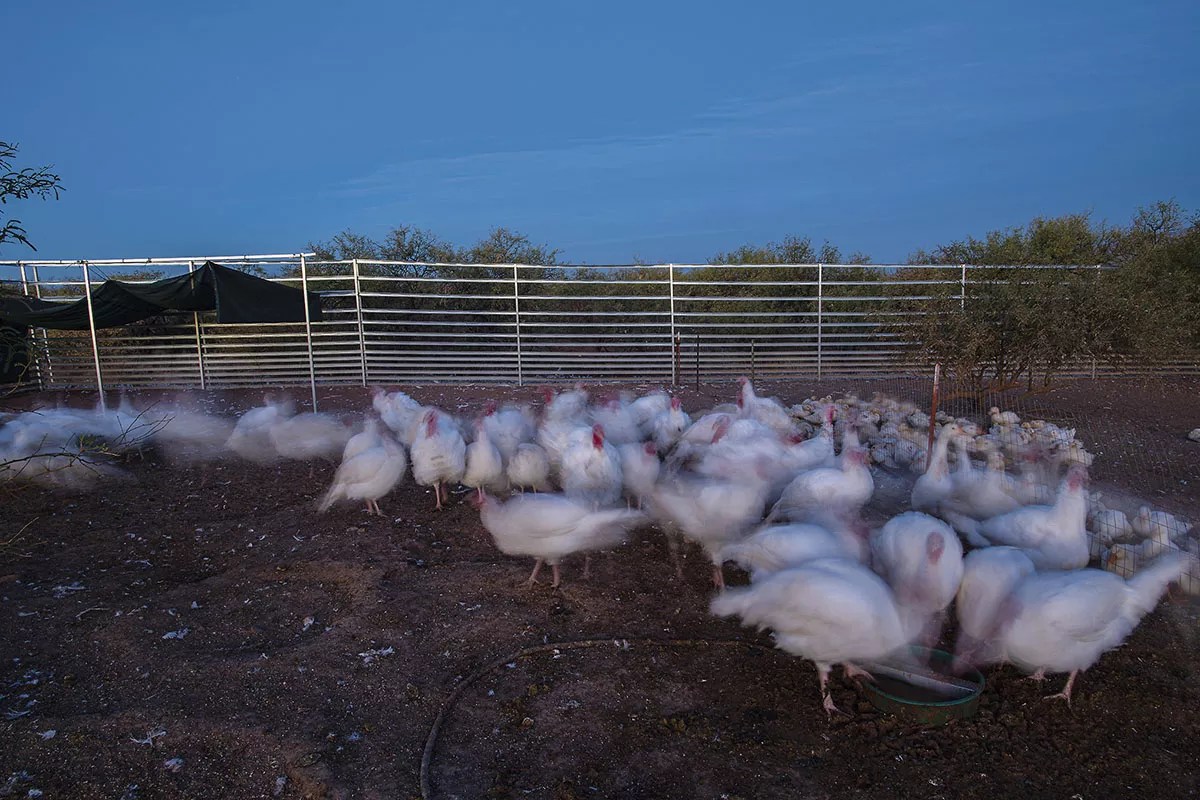 The birds trotted around a bit, passing in and out of the thatched shade of two mesquite trees. I eyed them. They eyed me. What I felt then was a simmering discomfort, though I not only eat meat but get paid to. “They’re friendly, you know,” Muthart said, stoking the feeling.