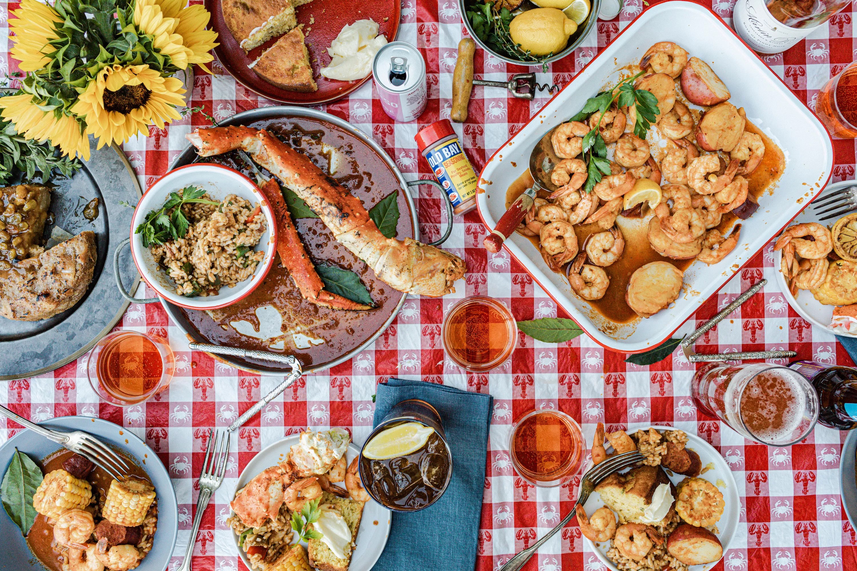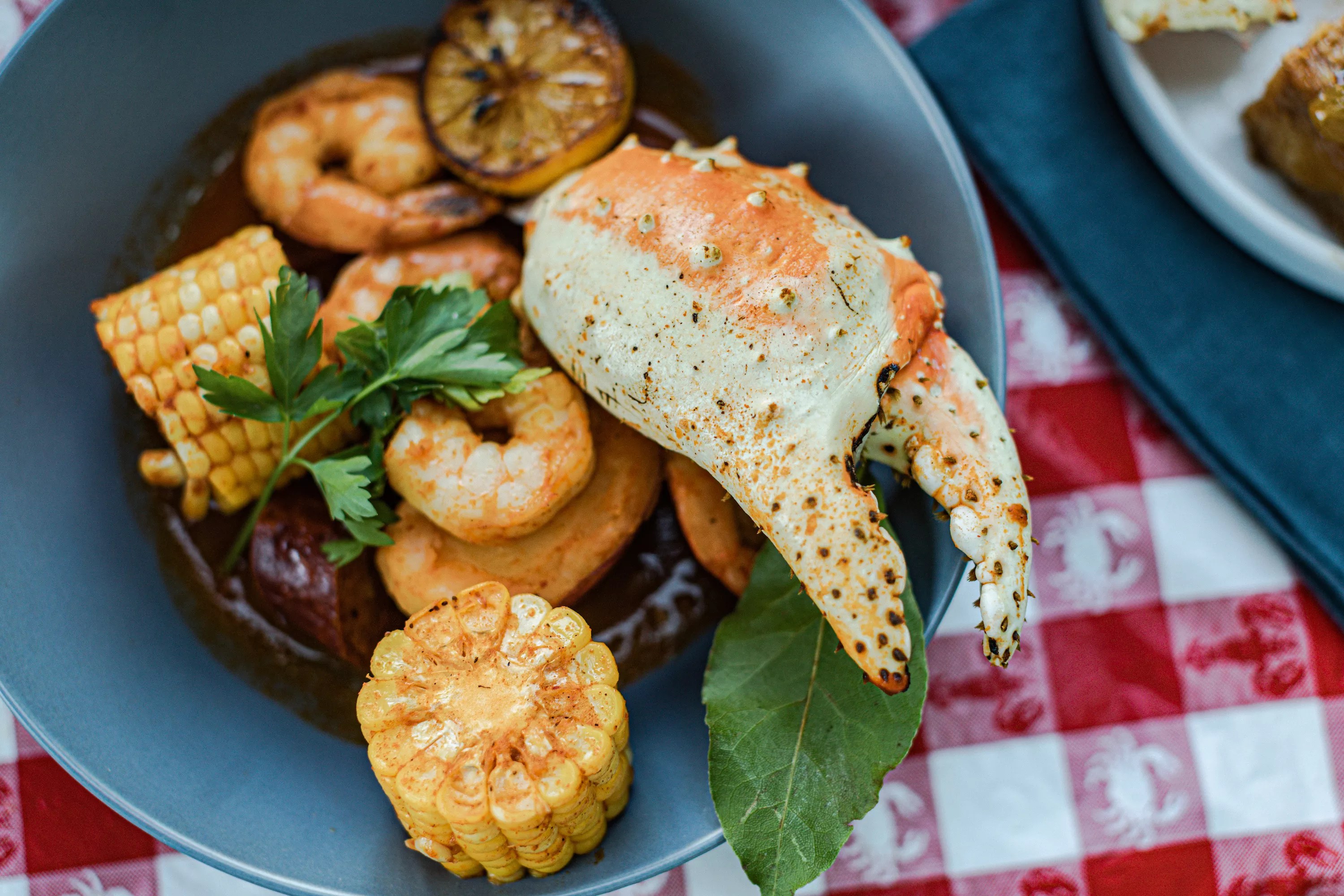 The Cajun shrimp boil serves anywhere from four to six people and includes peeled shrimp, corn on the cob, red potatoes, andouille sausage, jambalaya, New Orleans-style bread pudding with bourbon raisin sauce, jalapeno corn bread with honey butter, and sweet tea. The package is $75, and you may add king crab for an extra $35.