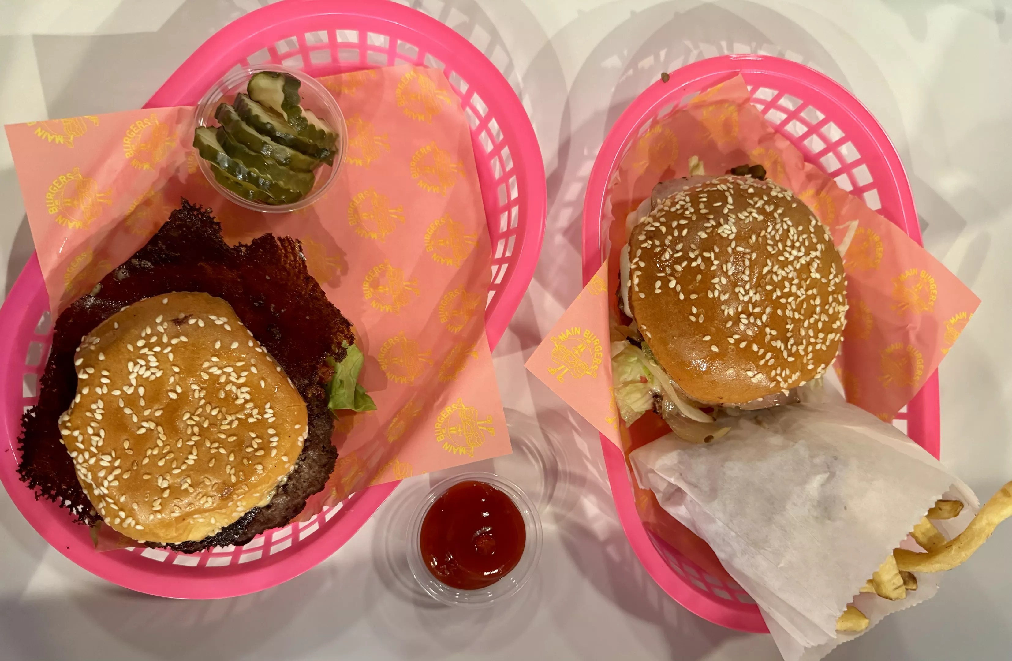 Once our fluorescent pink baskets finally hit the table, any impatient hanger melted away. Hernandez has described the patties as “semi-smashed,” and these aren’t paper-thin, lacy, crisp-edged smash burgers. Main Burgers have heft.