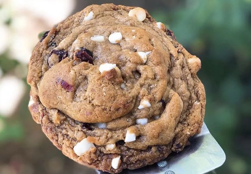 A vegan white chocolate, macadamia nut, and cranberry cookie.