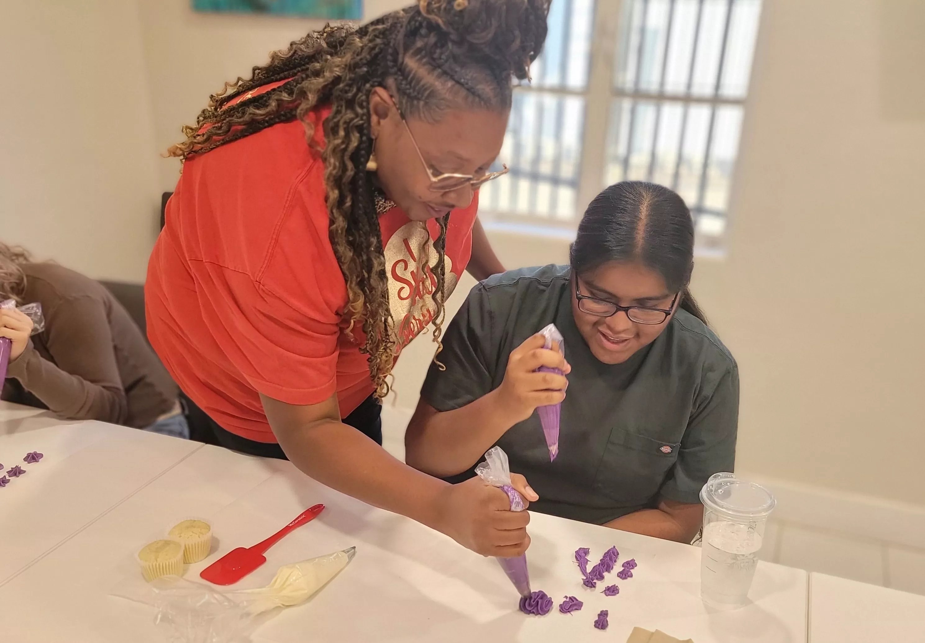 Red Velvet Bakery owner Myesha Harris helps Sam Dillon during a cupcake decorating class on Aug. 4.