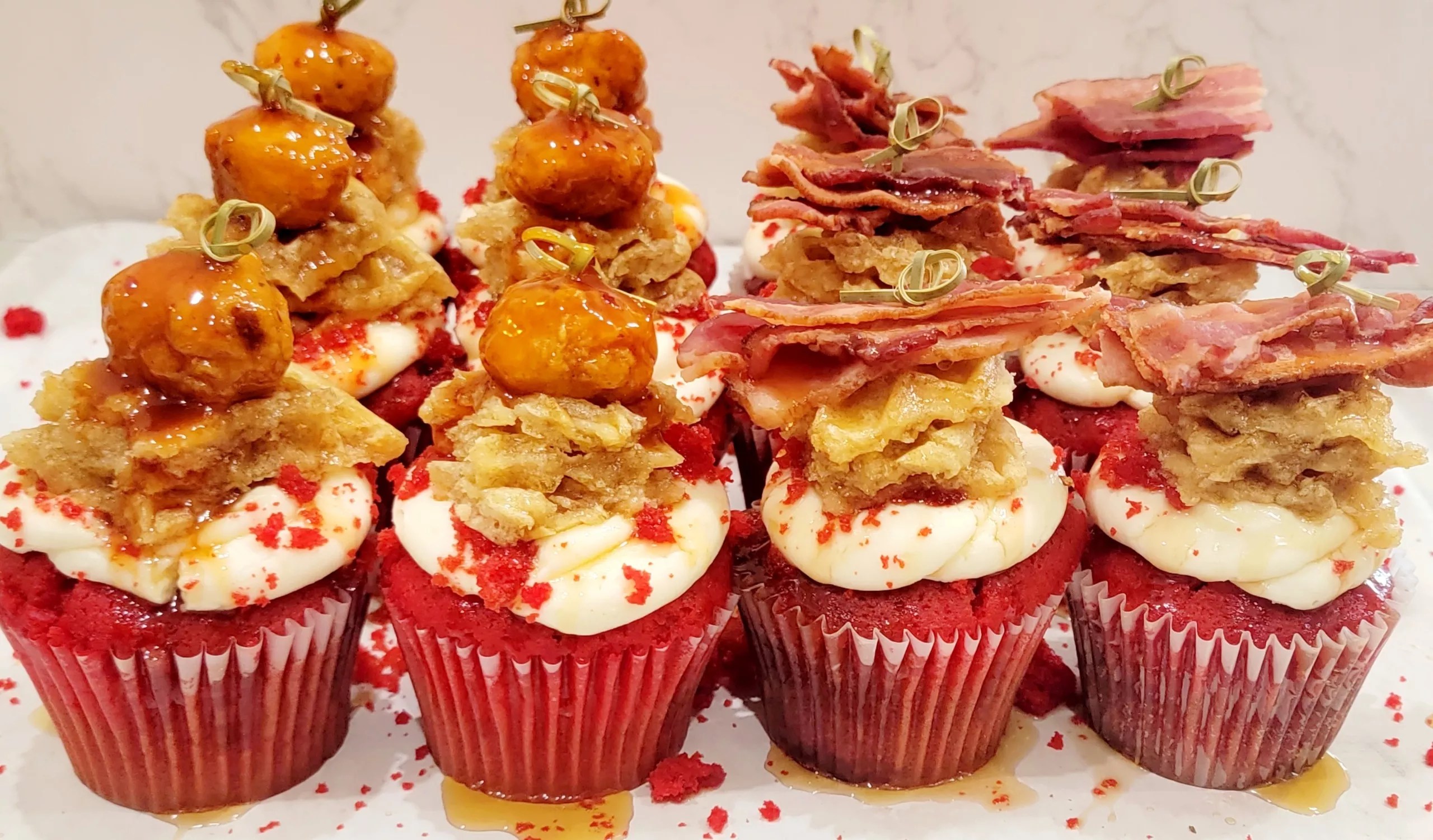 Dessert brunch cupcakes featuring pancakes and maple syrup, maple bacon, and chicken and waffles will be sold on Saturdays at Red Velvet Bakery.