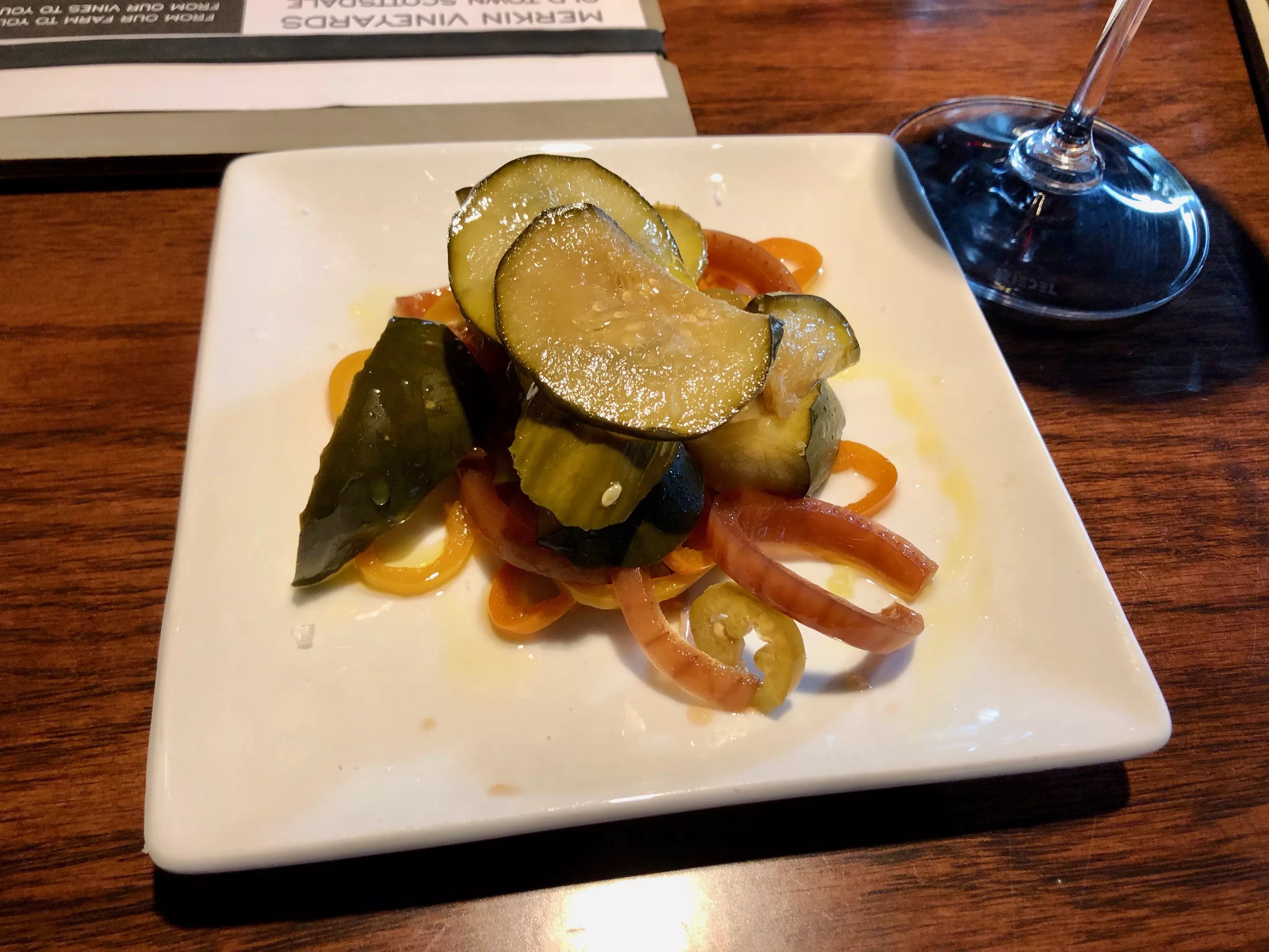 A vegetables section included cauliflower, Beet “Tartare,” and Sun Valley Harvest Mushrooms. Wanting to whet appetites with these Arizona-grown veggies, we ordered the Cucumber & Hot Chilies. Only, we didn’t get it. Because we’d expressed an initial interest in the plate of pickles before deciding on the cucumbers, we got the pickles anyway. We kept waiting for cucumbers that never came.