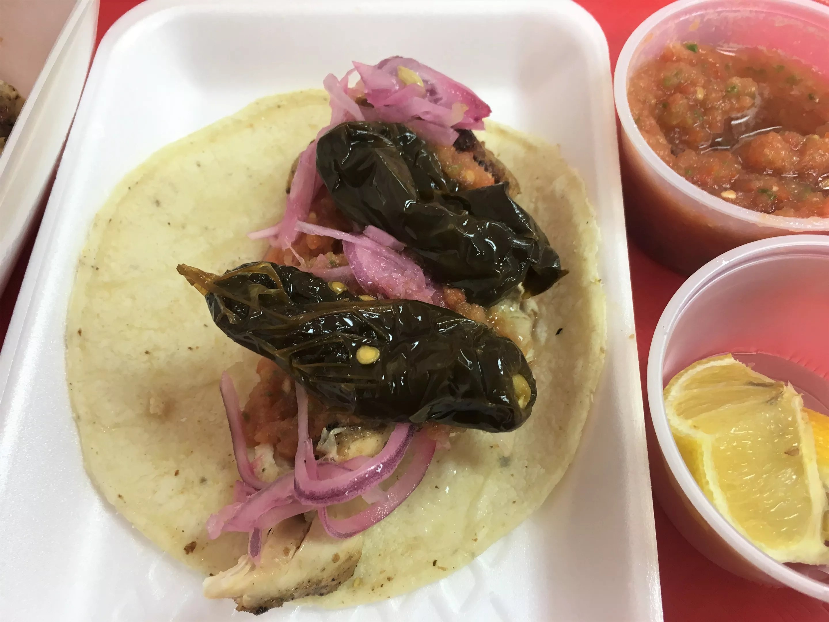 Chicken comes in a Styrofoam container. You can gnaw chicken straight from the leg or thigh, or you can get in there with your hands, tear off meat, place it onto a tortilla, and fix a hot taco. There is a savage pleasure to this. The plastic fork and knife aren’t up to the task, and who cares? Who wants to eat with utensils when what you can make an argument that what you’re eating is finger food?