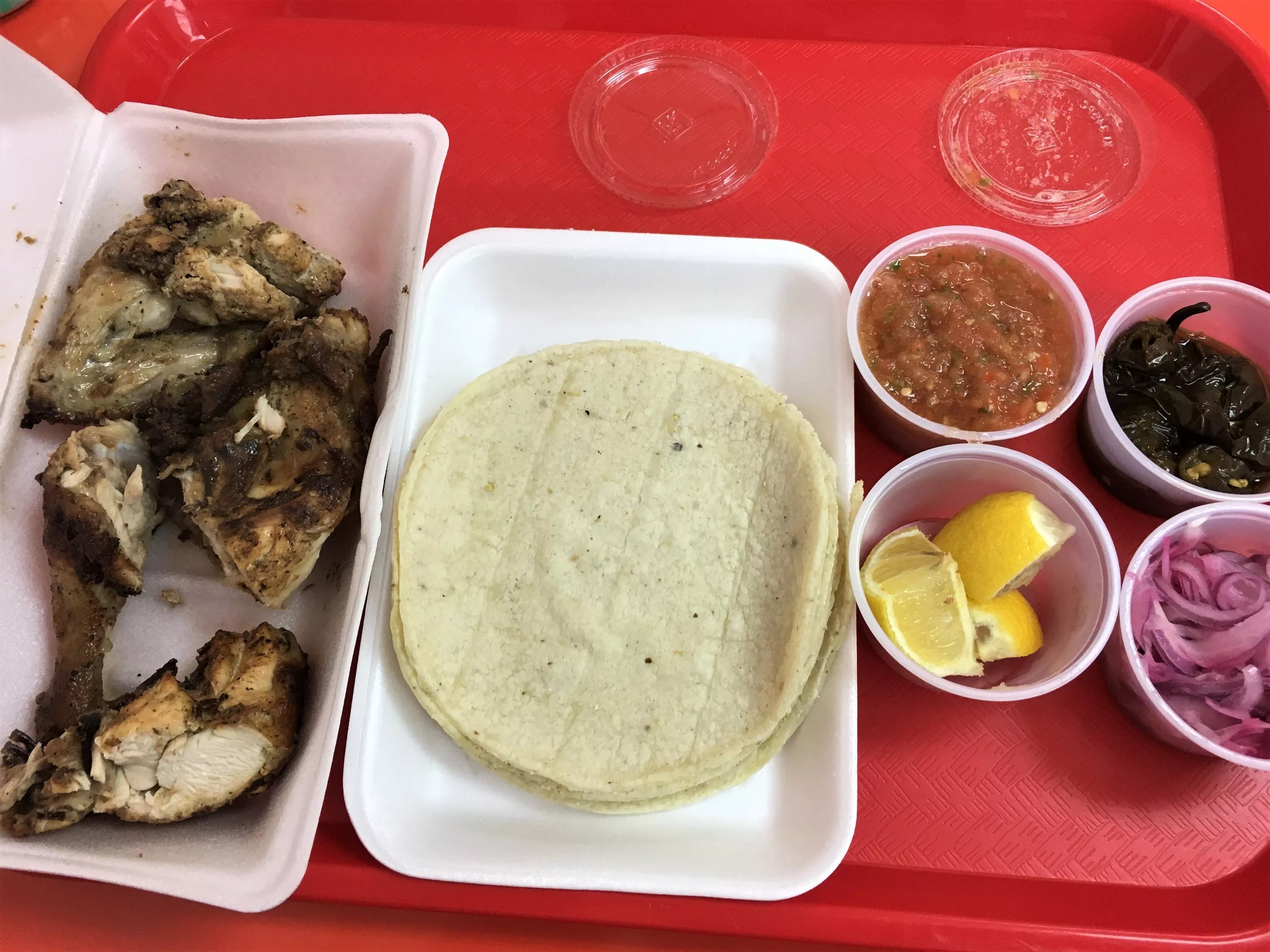 You can get three pieces of chicken, salsa, five tortillas, and a soda for $5. A half-chicken, segmented, comes out with containers of salsa, lemons, pickled red onions, green chiles, and tortillas. It costs $6.57. The whole bird will run you $13.12, a 10-piece platter $12.11. Aside from chicken, you can order macaroni salad, mashed potatoes, and beans.