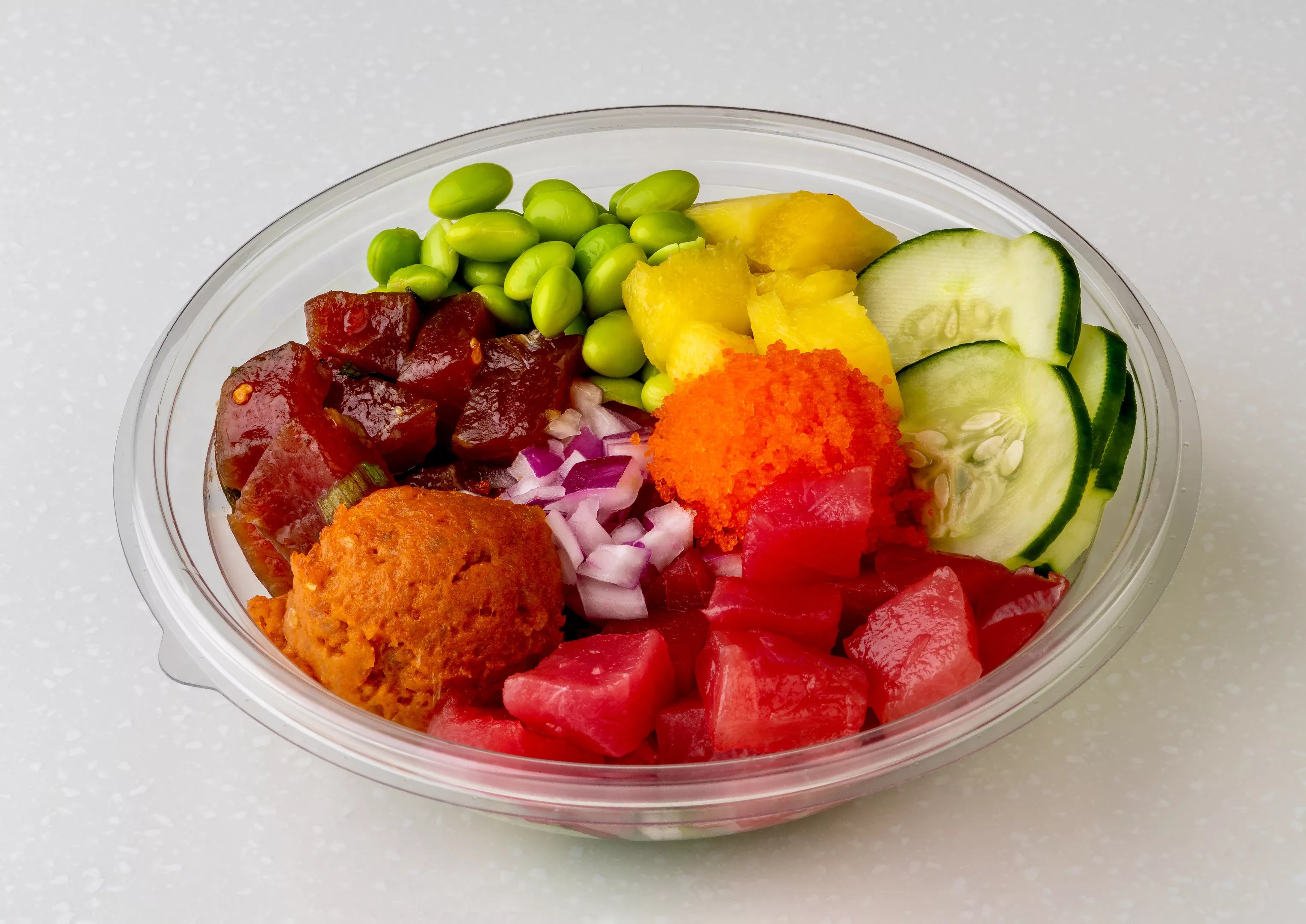 The colors of the rainbow in a poké bowl.