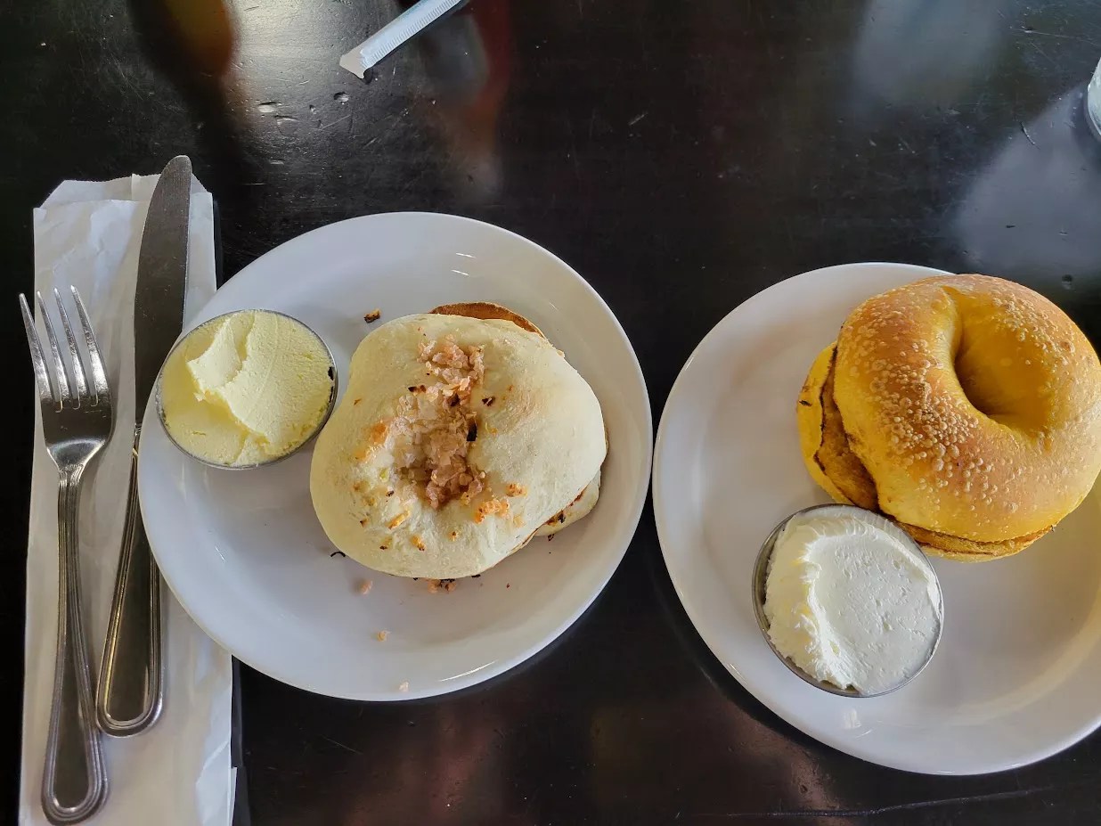 NY Bagels ‘N Bialys’ onion bialy with whipped butter (left) and classic yellow egg bagel with plain cream cheese (right) are made fresh .