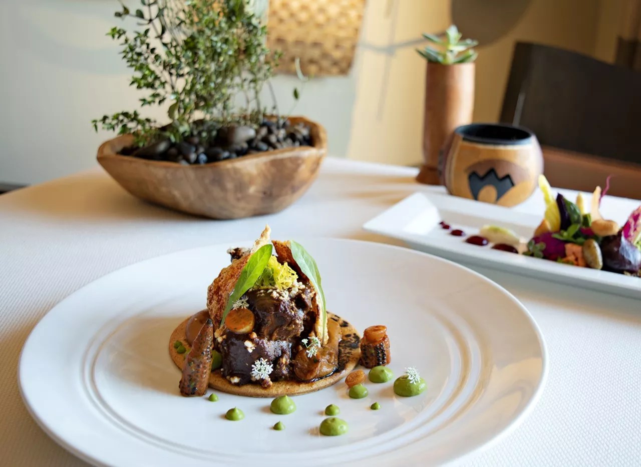 The most creative Indigenous food truck in the Valley has been parking in Laveen and fusing Native American and Mexican foods. Fry Bread Fanatics’ Mexican and Diné cook, Adriana Garcia, blankets green chile frybread enchiladas with toppings and laces them with crema. She buns a frybread-based take on the Sonoran hot dog. Her dessert frybreads are simply next level. They chameleon into numerous forms, taking the flavors of s’mores, churros, and pies like banana cream. Ask about her cart’s artwork. For one, the hummingbird represents Garcia’s late father, Diné, the source of her connection with traditional foods. Compressed lamb on ceme’t at Kai. Jackie Mercandetti Photo
