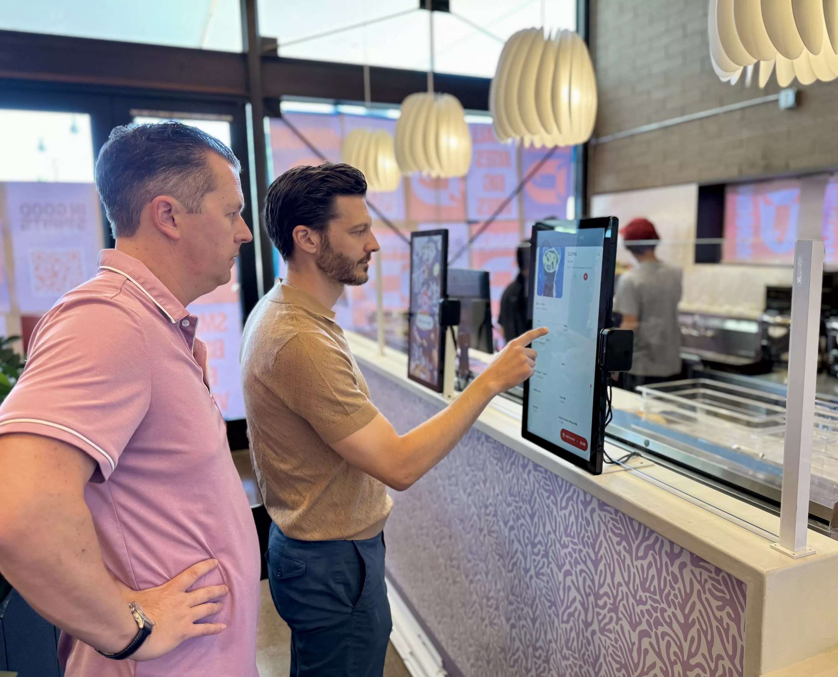 Kurtis Williams (left) and Andrew Fritz test Minnow’s ordering kiosk. Guests can order from two kiosks or at the counter. The restaurant also has a to-go window and a full-service bar.