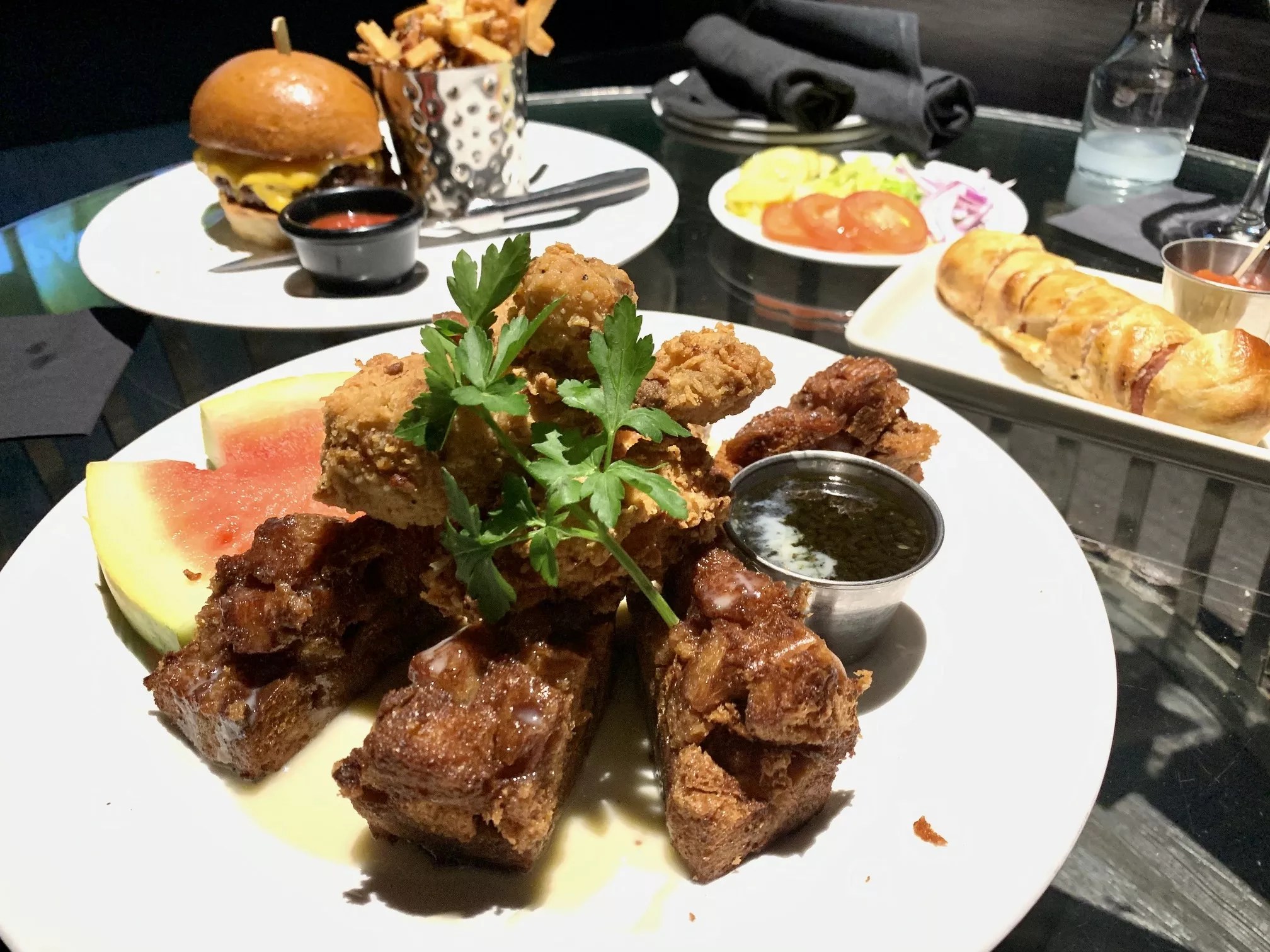 If the crummy acting is no surprise, I’m startled by how tasty the food is here. We’d ordered the Big Shot Burger cooked medium, and it comes nicely pink in the middle and crispy outside, atop a fluffy, garlicky brioche bun fresh from the oven. A side of skin-on fries are hot and crispy and perfectly salted. The Hot Dog Wellington is a fat and juicy frank swaddled in cheddar and baked in fluffy puff pastry.