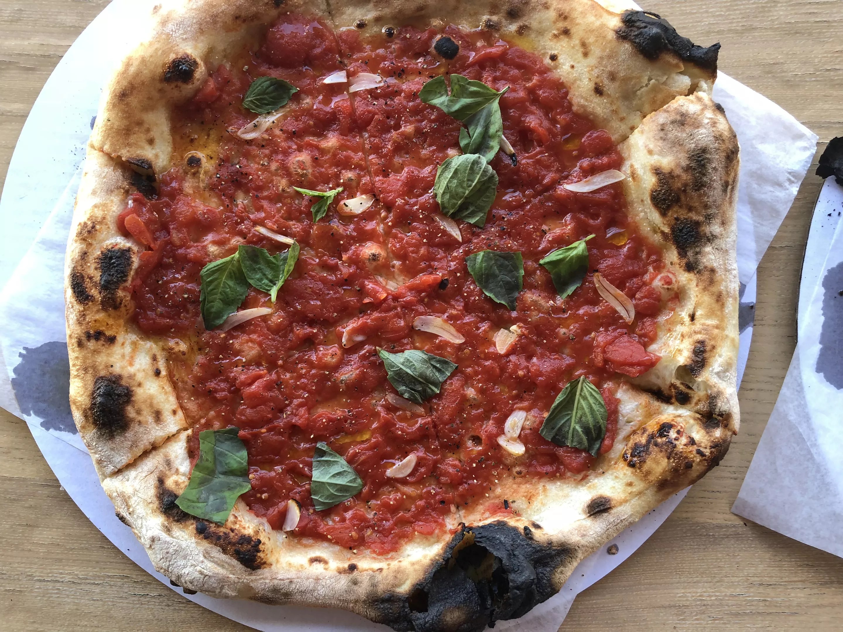His marinara pie features Bianco DiNapoli tomatoes, Blue Sky Organic Farms basil (torn), pepper, and sliced garlic soaked in olive oil so it won’t burn.