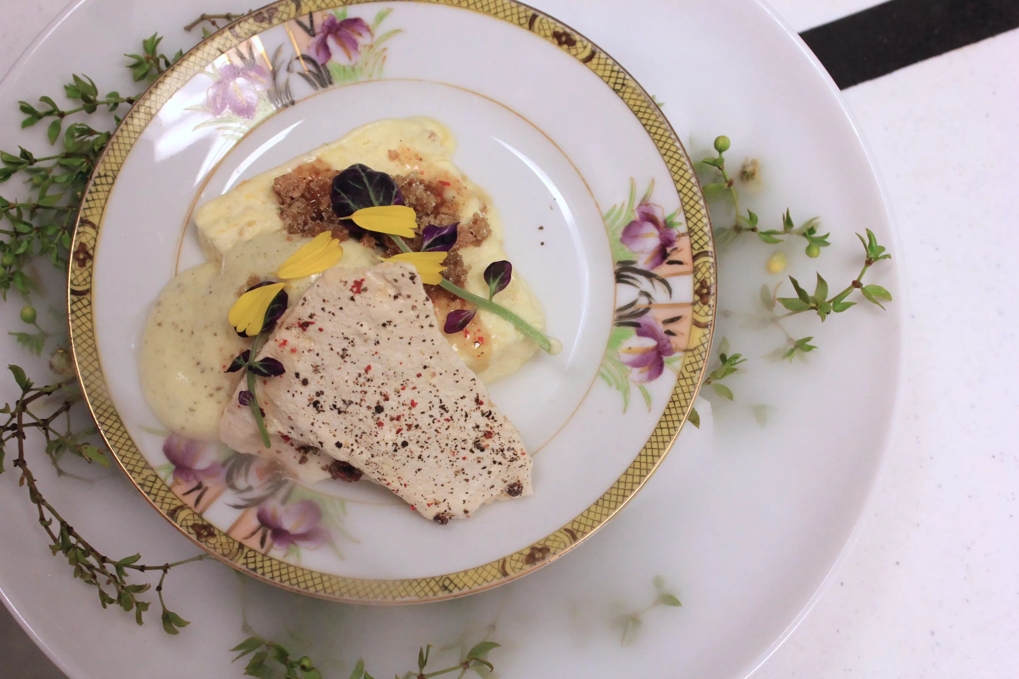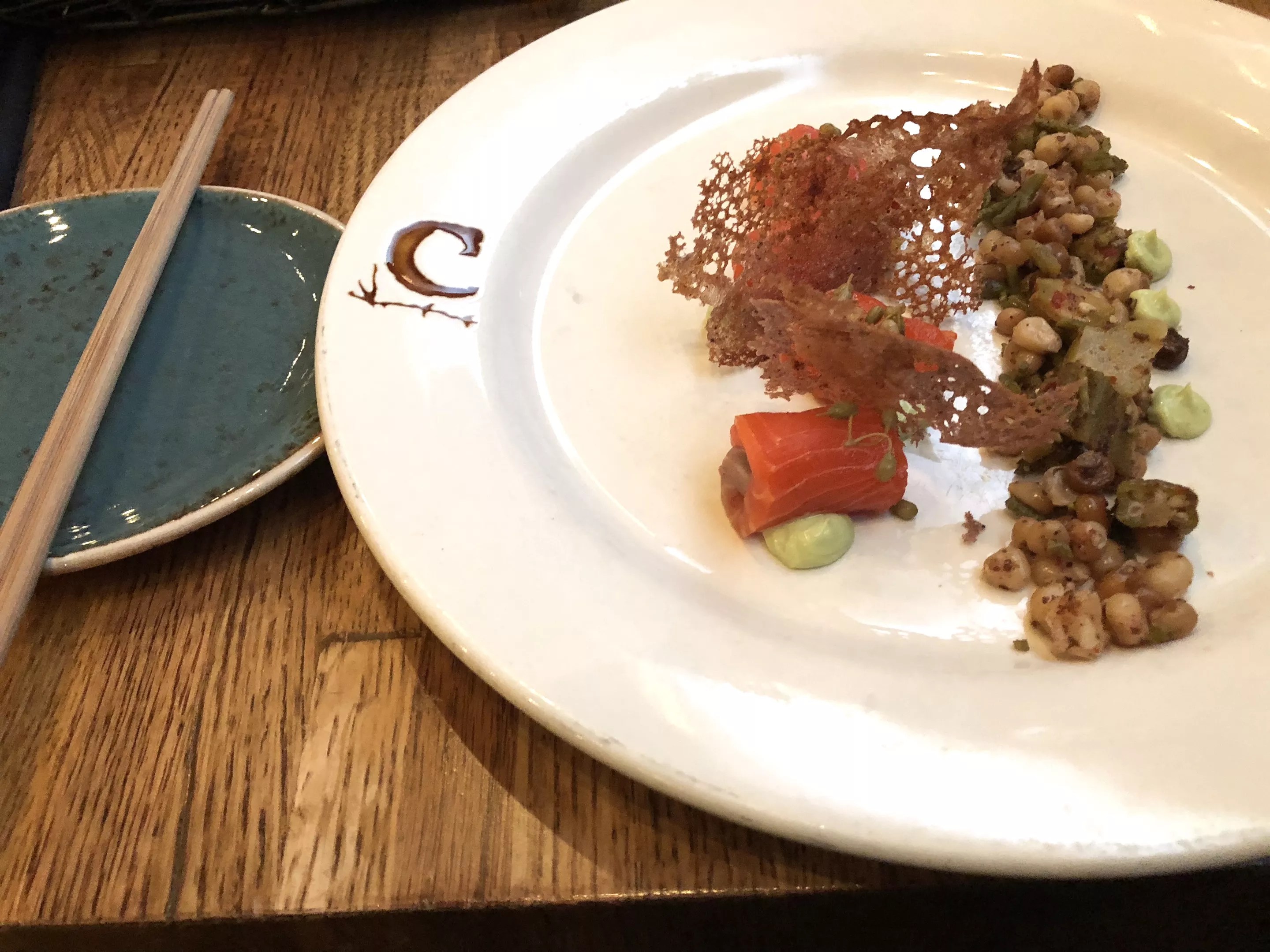 Sashimi with pickled palo verde berries, blue corn tuile, and Navajo-style steam corn at Cartwright’s.