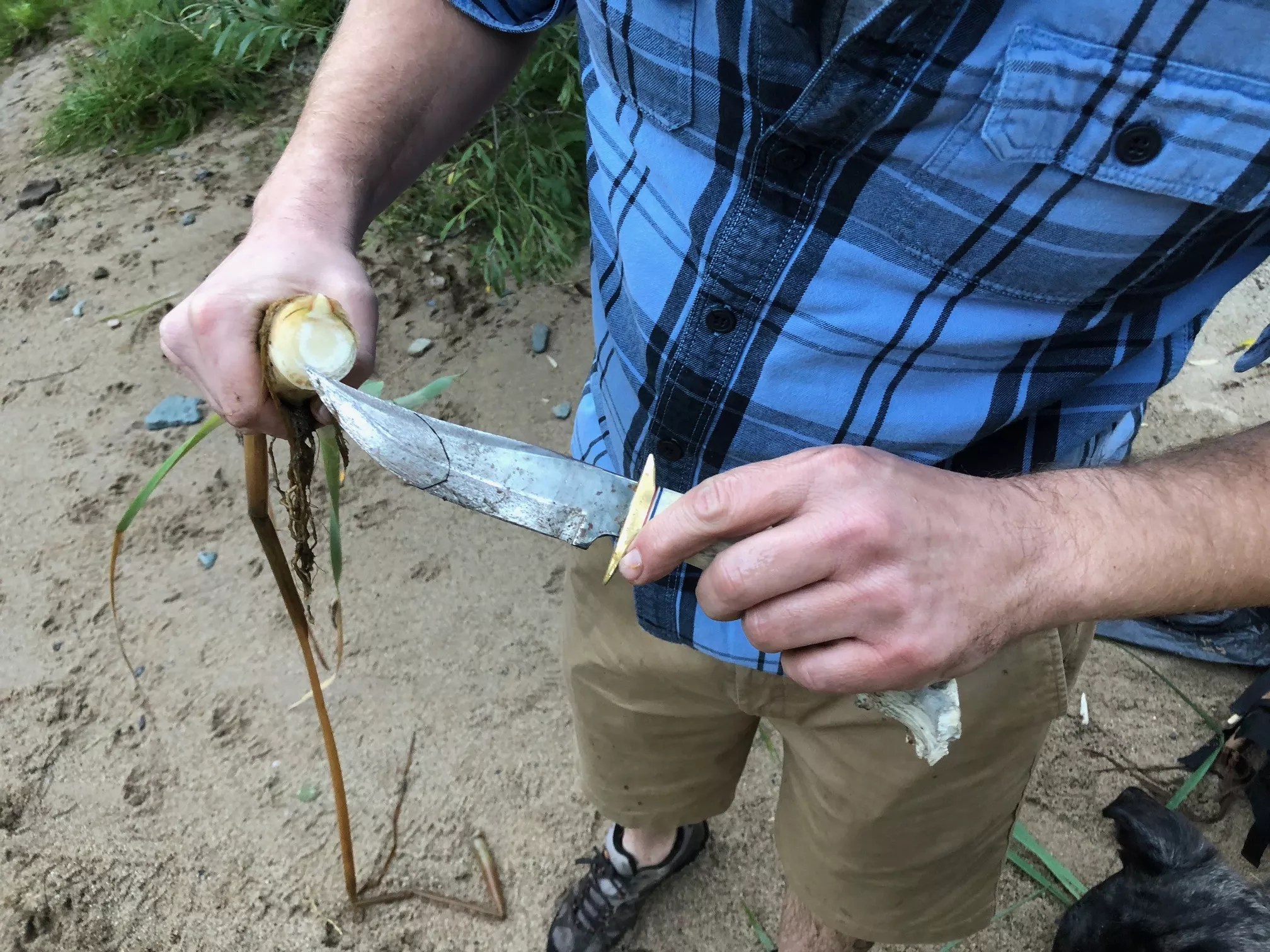 Vibber knifes into a cattail rhizome.