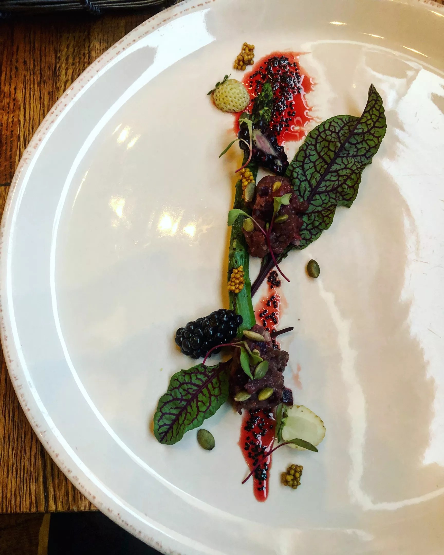 At Cartwright’s: a spear of asparagus with venison tartare, sorrel, green strawberries, and saguaro fruit jam.