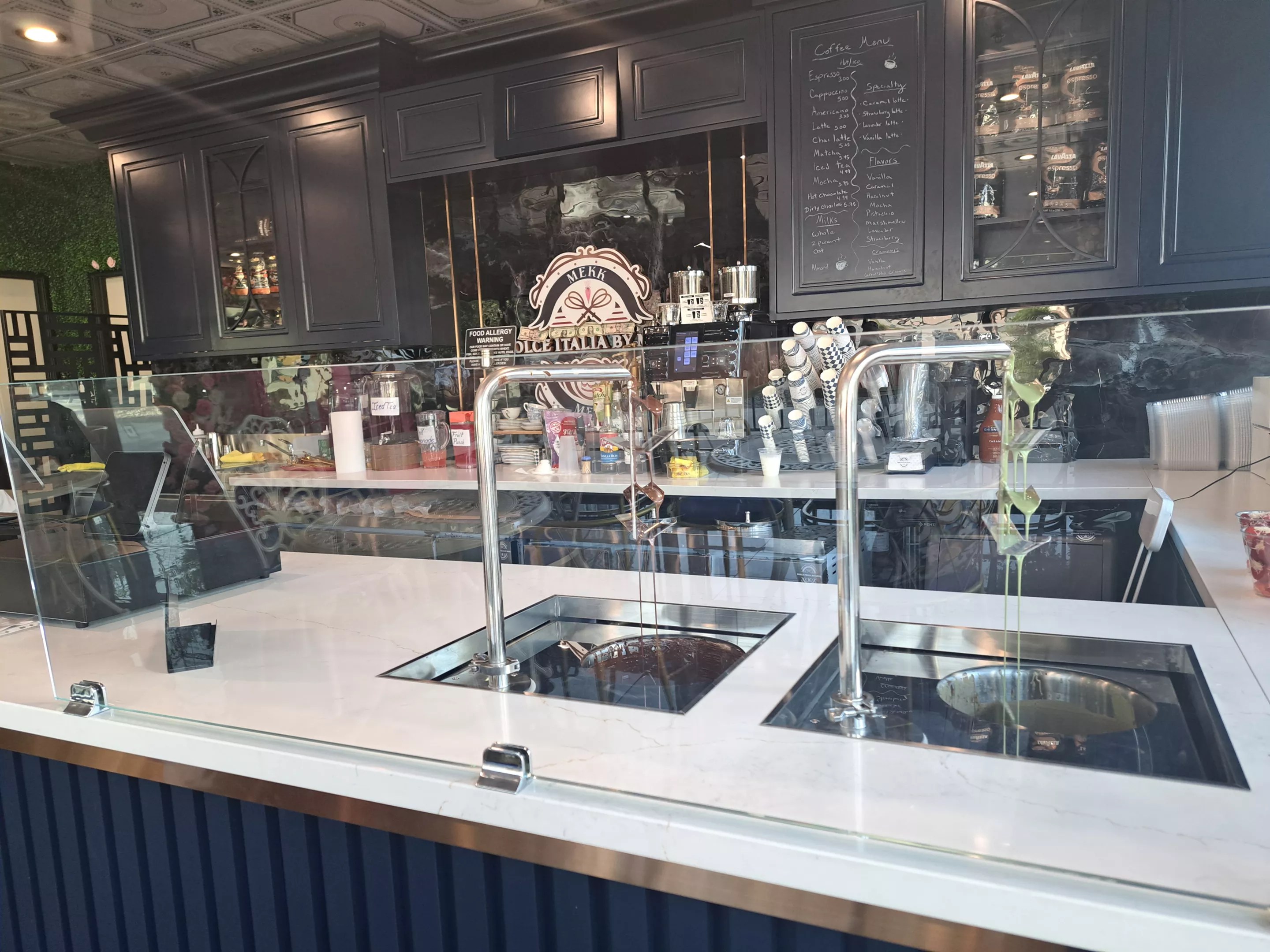 Those recipes make their way to the pastry cases, next to the two chocolate fountains behind the front counter. Customers can choose from dark chocolate or pistachio chocolate, each with their own fount, to top fresh strawberries.