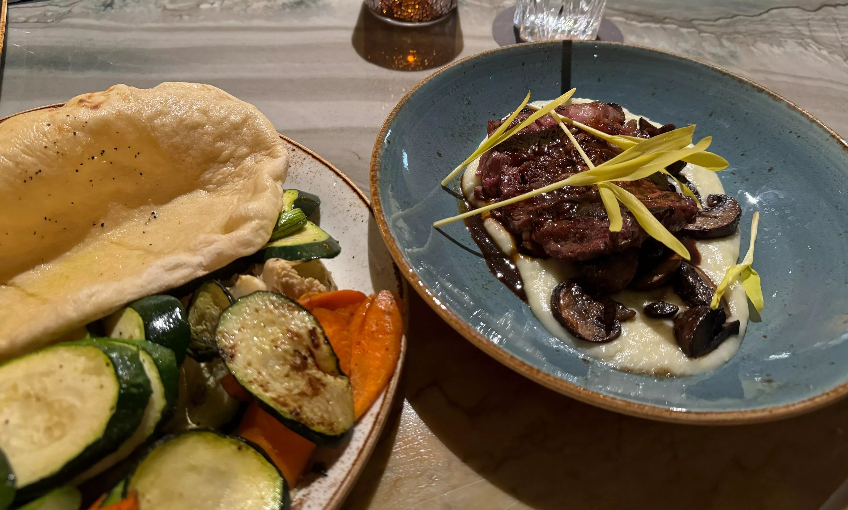 At Barley & Smoke. the 6-ounce ribeye is tender and thoughtfully cooked. The charred vegetables are served with housemade flatbread, tzatziki and hummus.