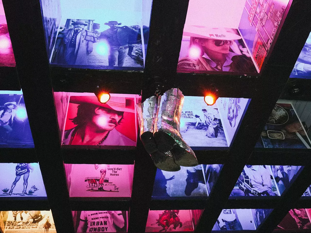 Disco ball boots hang from the ceiling over the dance floor at Not My First Rodeo.